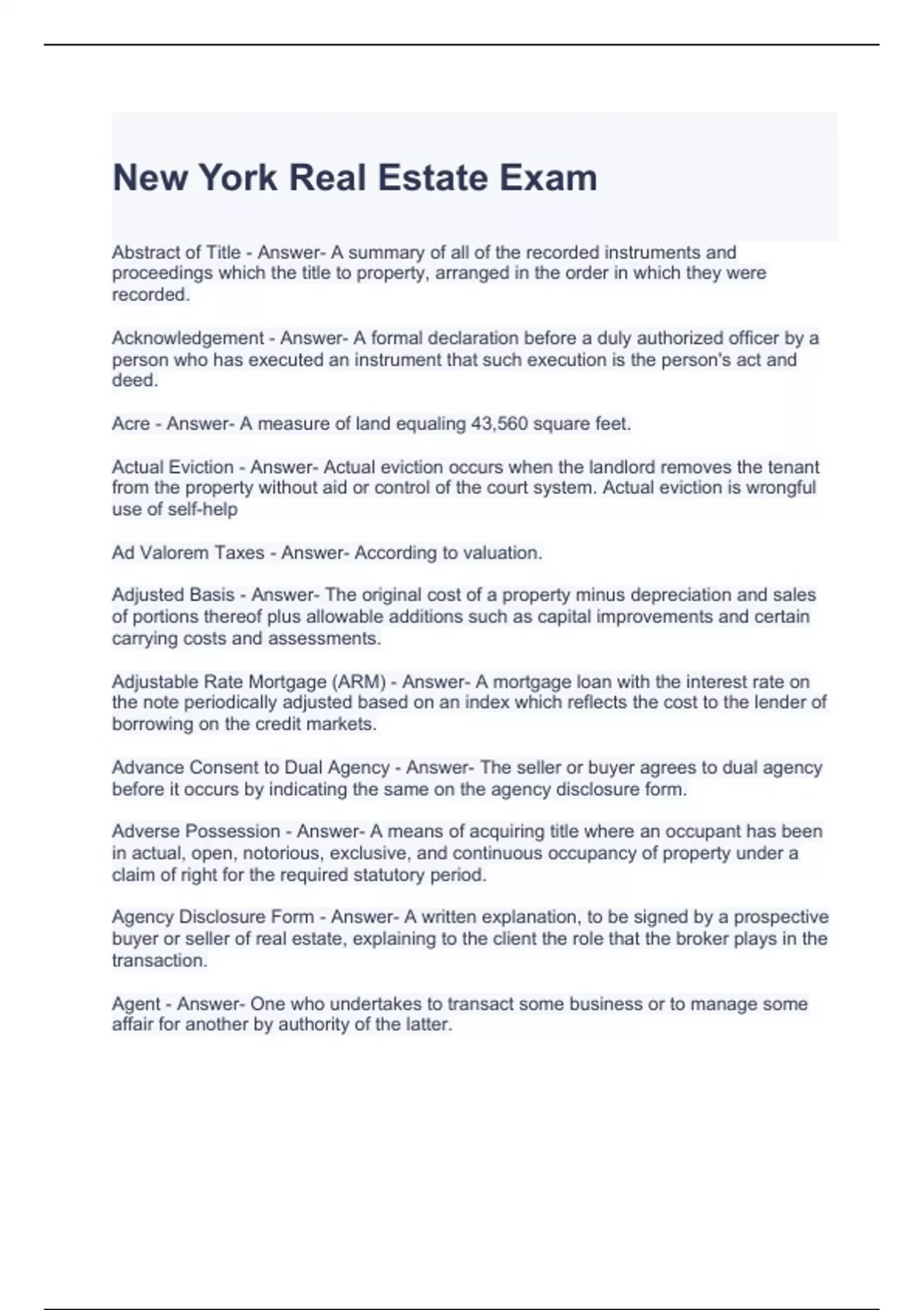 New York Real Estate Exam Questions and Answers