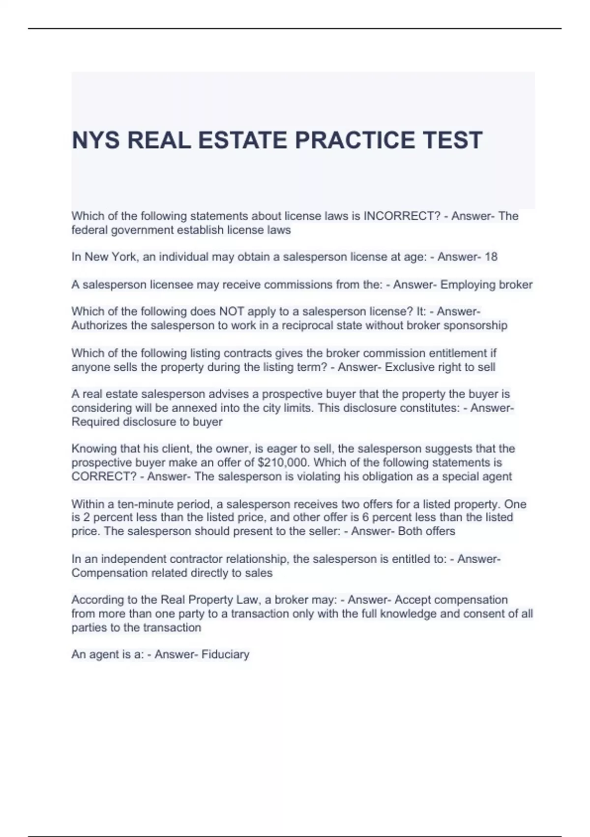 NYS REAL ESTATE PRACTICE TEST 100% SOLVED