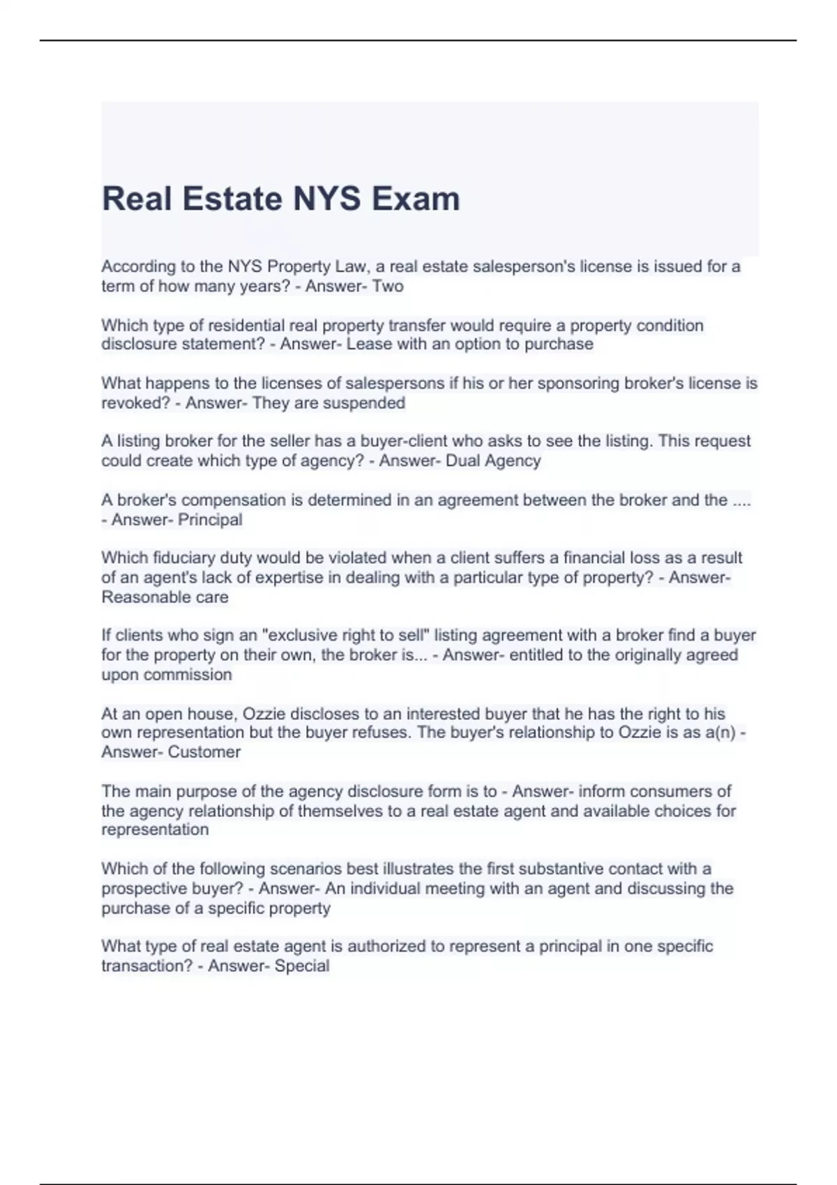 Real Estate NYS Exam Questions and Answers