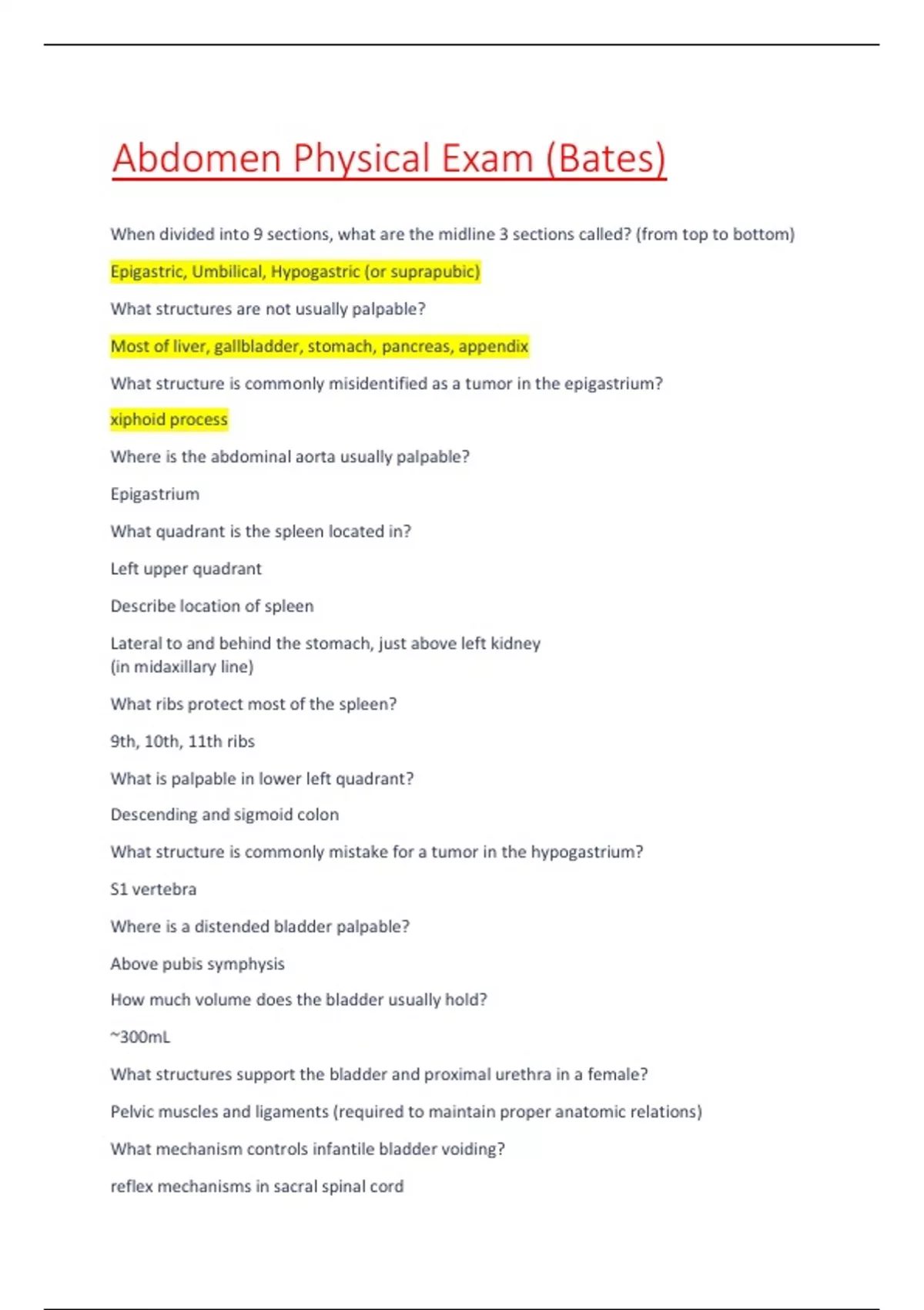 What structures are not usually palpable? Most of liver, gallbladder, stomach, pancreas, appendix What structure is commonly misidentified as a tumor in the epigastrium? xiphoid process Where is the abdominal aorta usually palpable? Epigastrium What quadrant is the spleen located in? Left upper quadrant Describe location of spleen Lateral to and behind the stomach, just above left kidney (in midaxillary line) What ribs protect most of the spleen? 9th, 10th, 11th ribs What is palpable in lower left quadrant? Descending and sigmoid colon What structure is commonly mistake for a tumor in the hypogastrium? S1 vertebra Where is a distended bladder palpable? Above pubis symphysis How much volume does the bladder usually hold? ~300mL What structures support the bladder and proximal urethra in a female? Pelvic muscles and ligaments (required to maintain proper anatomic relations) What mechanism controls infantile bladder voiding? reflex mechanisms in sacral spinal cord
