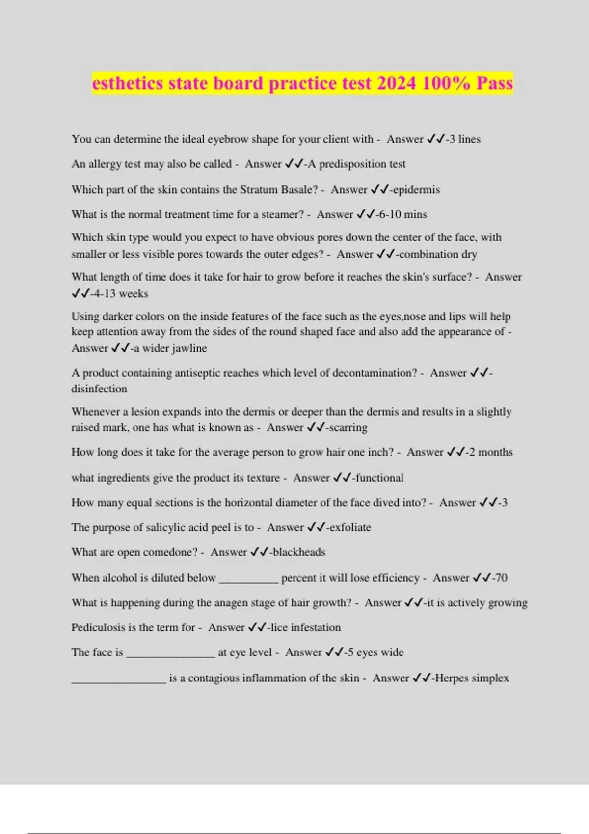 esthetics state board practice test 2024 100% Pass You can determine the ideal eyebrow shape for your client with - Answer ️️ -3 lines An allergy test may also be called - Answer ️️ -A predisposition test Which part of the skin contains the Stratum Basale? - Answer ️️ -epidermis What is the normal treatment time for a steamer? - Answer ️️ -6-10 mins Which skin type would you expect to have obvious pores down the center of the face, with smaller or less visible pores towards the outer edges? - Answer ️️ -combination dry What length of time does it take for hair to grow before it reaches the skin's surface? - Answer ️️ -4-13 weeks Using darker colors on the inside features of the face such as the eyes,nose and lips will help keep attention away from the sides of the round shaped face and also add the appearance of - Answer ️️ -a wider jawline A product containing antiseptic reaches which level of decontamination? - Answer ️️ - disinfection Whenever a lesion expands into the dermis or deeper than the dermis and results in a slightly raised mark, one has what is known as - Answer ️️ -scarring How long does it take for the average person to grow hair one inch? - Answer ️️ -2 months what ingredients give the product its texture - Answer ️️ -functional How many equal sections is the horizontal diameter of the face dived into? - Answer ️️ -3 The purpose of salicylic acid peel is to - Answer ️️ -exfoliate What are open comedone? - Answer ️️ -blackheads