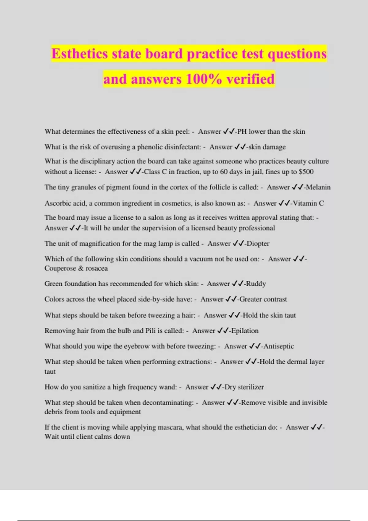 Esthetics state board practice test questions and answers 100% verified What determines the effectiveness of a skin peel: - Answer ️️ -PH lower than the skin What is the risk of overusing a phenolic disinfectant: - Answer ️️ -skin damage What is the disciplinary action the board can take against someone who practices beauty culture without a license: - Answer ️️ -Class C in fraction, up to 60 days in jail, fines up to $500 The tiny granules of pigment found in the cortex of the follicle is called: - Answer ️️ -Melanin Ascorbic acid, a common ingredient in cosmetics, is also known as: - Answer ️️ -Vitamin C The board may issue a license to a salon as long as it receives written approval stating that: - Answer ️️ -It will be under the supervision of a licensed beauty professional The unit of magnification for the mag lamp is called - Answer ️️ -Diopter Which of the following skin conditions should a vacuum not be used on: - Answer ️️ - Couperose & rosacea Green foundation has recommended for which skin: - Answer ️️ -Ruddy Colors across the wheel placed side-by-side have: - Answer ️️ -Greater contrast What steps should be taken before tweezing a hair: - Answer ️️ -Hold the skin taut Removing hair from the bulb and Pili is called: - Answer ️️ -Epilation What should you wipe the eyebrow with before tweezing: - Answer ️️ -Antiseptic What step should be taken when performing extractions: - Answer ️️ -Hold the dermal layer taut How do you sanitize a high frequency wand: - Answer ️️ -Dry sterilizer What step should be taken when decontaminating: - Answer ️️ -Remove visible and invisible debris from tools and equipment If the client is moving while applying mascara, what should the esthetician do: - Answer ️️ - Wait until client calms down