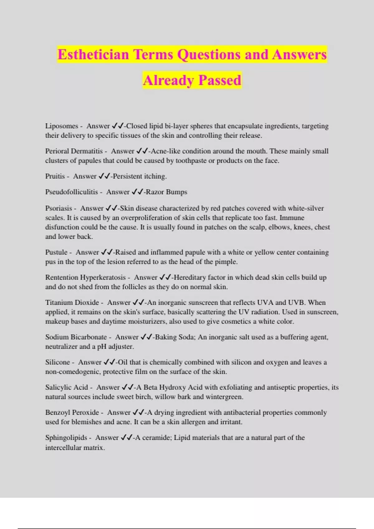 Esthetician Terms Questions and Answers Already Passed Liposomes - Answer ️️ -Closed lipid bi-layer spheres that encapsulate ingredients, targeting their delivery to specific tissues of the skin and controlling their release. Perioral Dermatitis - Answer ️️ -Acne-like condition around the mouth. These mainly small clusters of papules that could be caused by toothpaste or products on the face. Pruitis - Answer ️️ -Persistent itching. Pseudofolliculitis - Answer ️️ -Razor Bumps Psoriasis - Answer ️️ -Skin disease characterized by red patches covered with white-silver scales. It is caused by an overproliferation of skin cells that replicate too fast. Immune disfunction could be the cause. It is usually found in patches on the scalp, elbows, knees, chest and lower back. Pustule - Answer ️️ -Raised and inflammed papule with a white or yellow center containing pus in the top of the lesion referred to as the head of the pimple. Rentention Hyperkeratosis - Answer ️️ -Hereditary factor in which dead skin cells build up and do not shed from the follicles as they do on normal skin. Titanium Dioxide - Answer ️️ -An inorganic sunscreen that reflects UVA and UVB. When applied, it remains on the skin's surface, basically scattering the UV radiation. Used in sunscreen, makeup bases and daytime moisturizers, also used to give cosmetics a white color. Sodium Bicarbonate - Answer ️️ -Baking Soda; An inorganic salt used as a buffering agent, neutralizer and a pH adjuster. Silicone - Answer ️️ -Oil that is chemically combined with silicon and oxygen and leaves a non-comedogenic, protective film on the surface of the skin. Salicylic Acid - Answer ️️ -A Beta Hydroxy Acid with exfoliating and antiseptic properties, its natural sources include sweet birch, willow bark and wintergreen. Benzoyl Peroxide - Answer ️️ -A drying ingredient with antibacterial properties commonly used for blemishes and acne. It can be a skin allergen and irritant. Sphingolipids - Answer ️️ -A ceramide; Lipid materials that are a natural part of the intercellular matrix.