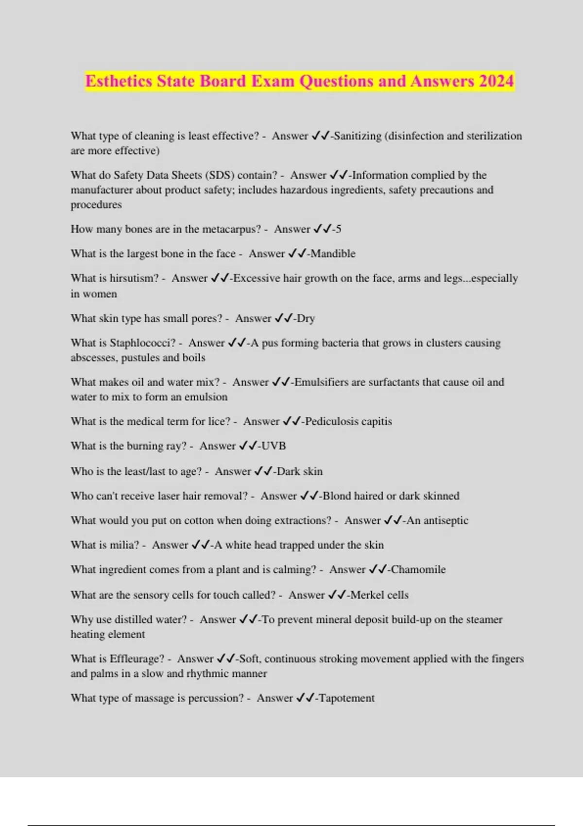 Esthetics State Board Exam Questions and Answers 2024 What type of cleaning is least effective? - Answer ️️ -Sanitizing (disinfection and sterilization are more effective) What do Safety Data Sheets (SDS) contain? - Answer ️️ -Information complied by the manufacturer about product safety; includes hazardous ingredients, safety precautions and procedures How many bones are in the metacarpus? - Answer ️️ -5 What is the largest bone in the face - Answer ️️ -Mandible What is hirsutism? - Answer ️️ -Excessive hair growth on the face, arms and legs...especially in women What skin type has small pores? - Answer ️️ -Dry What is Staphlococci? - Answer ️️ -A pus forming bacteria that grows in clusters causing abscesses, pustules and boils What makes oil and water mix? - Answer ️️ -Emulsifiers are surfactants that cause oil and water to mix to form an emulsion What is the medical term for lice? - Answer ️️ -Pediculosis capitis What is the burning ray? - Answer ️️ -UVB Who is the least/last to age? - Answer ️️ -Dark skin Who can't receive laser hair removal? - Answer ️️ -Blond haired or dark skinned What would you put on cotton when doing extractions? - Answer ️️ -An antiseptic What is milia? - Answer ️️ -A white head trapped under the skin What ingredient comes from a plant and is calming? - Answer ️️ -Chamomile What are the sensory cells for touch called? - Answer ️️ -Merkel cells Why use distilled water? - Answer ️️ -To prevent mineral deposit build-up on the steamer heating element What is Effleurage? - Answer ️️ -Soft, continuous stroking movement applied with the fingers and palms in a slow and rhythmic manner What type of massage is percussion? - Answer ️️ -Tapotement