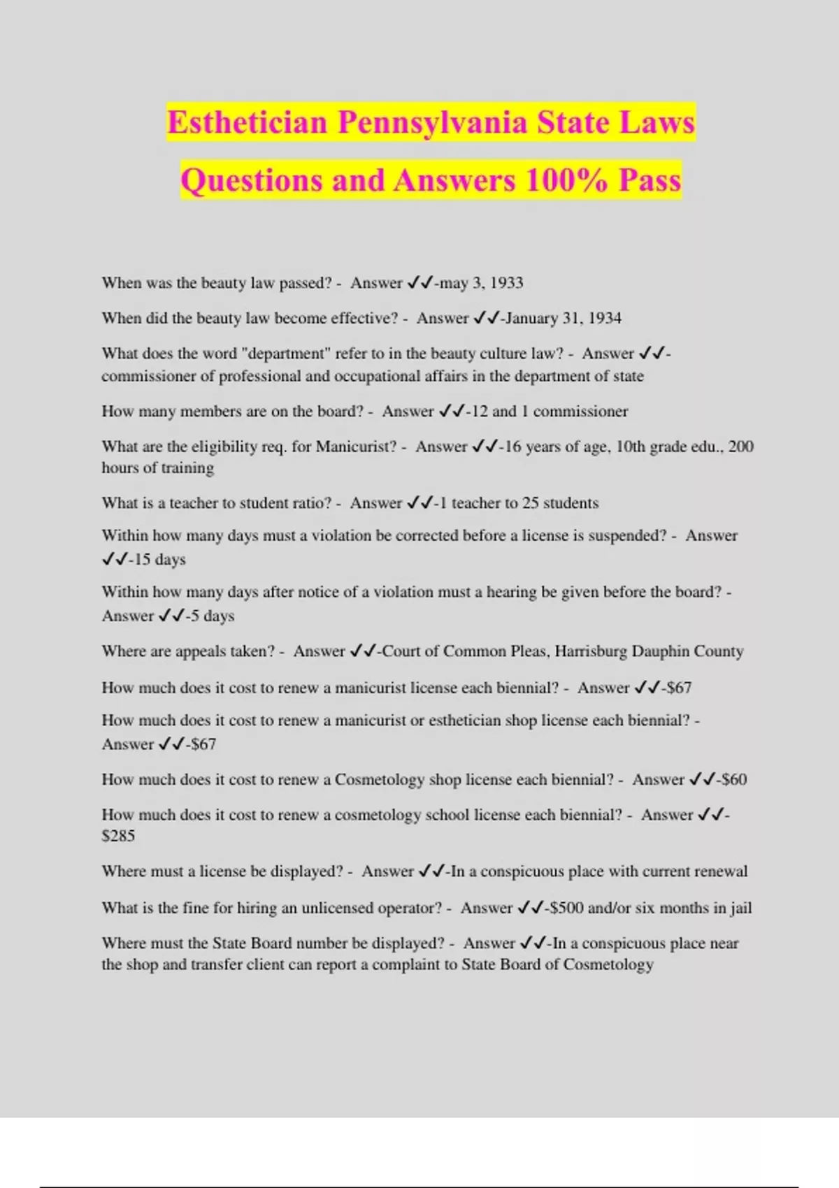 Esthetician Pennsylvania State Laws Questions and Answers 100% Pass When was the beauty law passed? - Answer ️️ -may 3, 1933 When did the beauty law become effective? - Answer ️️ -January 31, 1934 What does the word "department" refer to in the beauty culture law? - Answer ️️ - commissioner of professional and occupational affairs in the department of state How many members are on the board? - Answer ️️ -12 and 1 commissioner What are the eligibility req. for Manicurist? - Answer ️️ -16 years of age, 10th grade edu., 200 hours of training What is a teacher to student ratio? - Answer ️️ -1 teacher to 25 students Within how many days must a violation be corrected before a license is suspended? - Answer ️️ -15 days Within how many days after notice of a violation must a hearing be given before the board? - Answer ️️ -5 days Where are appeals taken? - Answer ️️ -Court of Common Pleas, Harrisburg Dauphin County How much does it cost to renew a manicurist license each biennial? - Answer ️️ -$67 How much does it cost to renew a manicurist or esthetician shop license each biennial? - Answer ️️ -$67 How much does it cost to renew a Cosmetology shop license each biennial? - Answer ️️ -$60 How much does it cost to renew a cosmetology school license each biennial? - Answer ️️ - $285 Where must a license be displayed? - Answer ️️ -In a conspicuous place with current renewal What is the fine for hiring an unlicensed operator? - Answer ️️ -$500 and/or six months in jail Where must the State Board number be displayed? - Answer ️️ -In a conspicuous place near the shop and transfer client can report a complaint to State Board of Cosmetology
