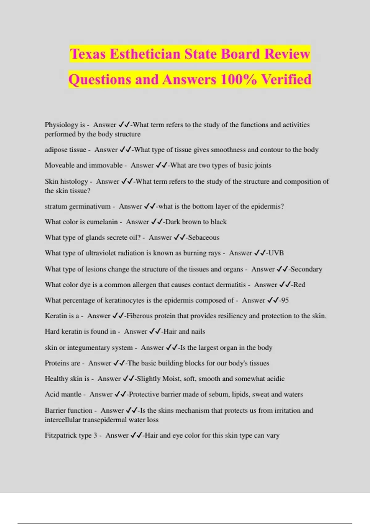 Texas Esthetician State Board Review Questions and Answers 100% Verified Physiology is - Answer ️️ -What term refers to the study of the functions and activities performed by the body structure adipose tissue - Answer ️️ -What type of tissue gives smoothness and contour to the body Moveable and immovable - Answer ️️ -What are two types of basic joints Skin histology - Answer ️️ -What term refers to the study of the structure and composition of the skin tissue? stratum germinativum - Answer ️️ -what is the bottom layer of the epidermis? What color is eumelanin - Answer ️️ -Dark brown to black What type of glands secrete oil? - Answer ️️ -Sebaceous What type of ultraviolet radiation is known as burning rays - Answer ️️ -UVB What type of lesions change the structure of the tissues and organs - Answer ️️ -Secondary What color dye is a common allergen that causes contact dermatitis - Answer ️️ -Red What percentage of keratinocytes is the epidermis composed of - Answer ️️ -95 Keratin is a - Answer ️️ -Fiberous protein that provides resiliency and protection to the skin. Hard keratin is found in - Answer ️️ -Hair and nails skin or integumentary system - Answer ️️ -Is the largest organ in the body Proteins are - Answer ️️ -The basic building blocks for our body's tissues Healthy skin is - Answer ️️ -Slightly Moist, soft, smooth and somewhat acidic Acid mantle - Answer ️️ -Protective barrier made of sebum, lipids, sweat and waters Barrier function - Answer ️️ -Is the skins mechanism that protects us from irritation and intercellular transepidermal water loss Fitzpatrick type 3 - Answer ️️ -Hair and eye color for this skin type can vary What is not a focus of a skin analysis - Answer ️️ -Skin care products the client uses at home What is a characteristic of mineral oil - Answer ️️ -Protects against dehydration What is a characteristic of mineral oil - Answer ️️ -Does not react with other chemicals involved in the skins function What is a characteristic of mineral oil - Answer ️️ -Helps prevent irritant skin contact What is not characteristic of mineral oil - Answer ️️ -Preservatives must be added to keep it fresh and potent over time What is an example of a inorganic physical sunscreen - Answer ️️ -Titanium dioxide How must ingredients be listed on cosmetic labels - Answer ️️ -Descending in predominance How should products be stored to make them last longer - Answer ️️ -In da