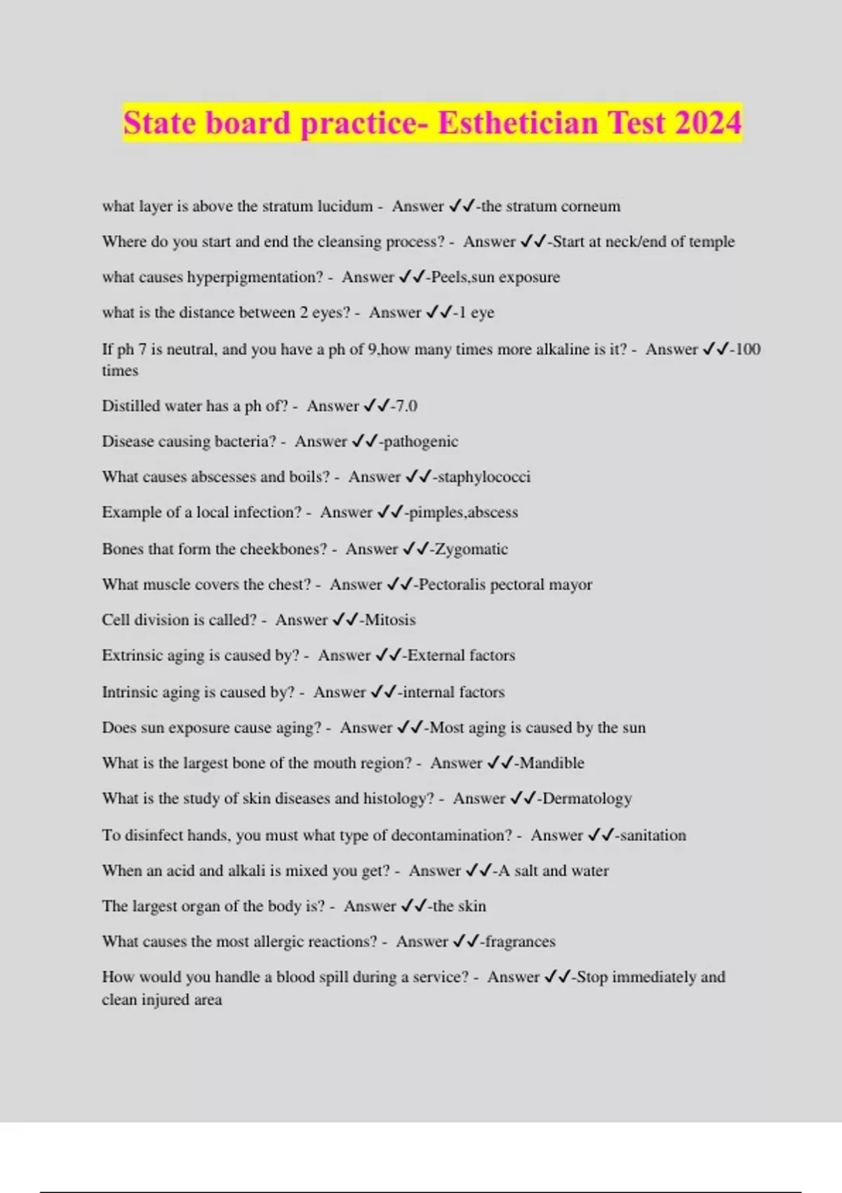 State board practice- Esthetician Test 2024 what layer is above the stratum lucidum - Answer ️️ -the stratum corneum Where do you start and end the cleansing process? - Answer ️️ -Start at neck/end of temple what causes hyperpigmentation? - Answer ️️ -Peels,sun exposure what is the distance between 2 eyes? - Answer ️️ -1 eye If ph 7 is neutral, and you have a ph of 9,how many times more alkaline is it? - Answer ️️ -100 times Distilled water has a ph of? - Answer ️️ -7.0 Disease causing bacteria? - Answer ️️ -pathogenic What causes abscesses and boils? - Answer ️️ -staphylococci Example of a local infection? - Answer ️️ -pimples,abscess Bones that form the cheekbones? - Answer ️️ -Zygomatic What muscle covers the chest? - Answer ️️ -Pectoralis pectoral mayor Cell division is called? - Answer ️️ -Mitosis Extrinsic aging is caused by? - Answer ️️ -External factors Intrinsic aging is caused by? - Answer ️️ -internal factors Does sun exposure cause aging? - Answer ️️ -Most aging is caused by the sun What is the largest bone of the mouth region? - Answer ️️ -Mandible What is the study of skin diseases and histology? - Answer ️️ -Dermatology To disinfect hands, you must what type of decontamination? - Answer ️️ -sanitation When an acid and alkali is mixed you get? - Answer ️️ -A salt and water The largest organ of the body is? - Answer ️️ -the skin What causes the most allergic reactions? - Answer ️️ -fragrances How would you handle a blood spill during a service? - Answer ️️ -Stop immediately and clean injured area