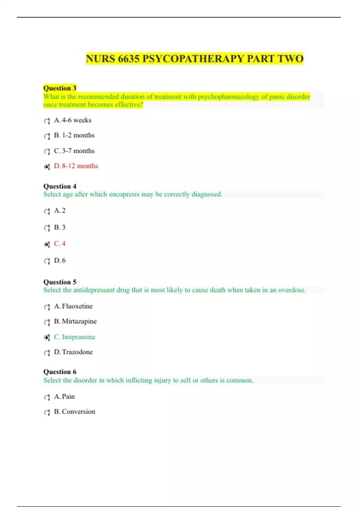 NURS 6635 PSYCOPATHERAPY PART TWO Question 3 A. 4-6 weeks B. 1-2 months C. 3-7 months D. 8-12 months Question 4 Select age after which encopresis may be correctly diagnosed. A. 2 B. 3 C. 4 D. 6 Question 5 Select the antidepressant drug that is most likely to cause death when taken in an overdose. A. Fluoxetine B. Mirtazapine C. Imipramine D. Trazodone Question 6 Select the disorder in which inflicting injury to self or others is common. A. Pain B. Conversion C. Somatic symptom D. Factitious Question 7 A. 0.1-0.5 B. 0.6-1.2 C. 1.4-1.9 D. 2.0-2.6 Question 9 A. Fluoxetine B. Desipramine C. Venlafaxine D. Bupropion Question 10 A. Depression B. Adjustment C. Bipolar Shor D. Anxiety t Question 11 Select the short rating scale used to assess change in psychiatric inpatients. A. PANSS B. BPRS C. HAM-D D. CAPS Question 12 A. Opioid analgesics B. TCA and SSRI antidepressants C. Beta-adrenergic blockers D. Mood stabilizers Question 13 A. Angina pectoris B. Asthma C. Diabetes D. Multiple sclerosis Question 14 Select the most commonly occurring eating disorder. A. Anorexia nervosa B. Bulimia nervosa C. Purging D. Binge Question 15 Select the age stage of life in which identity crisis typically emerges. A. Childhood B. Adolescence C. Middle adult D. Elderly adult Question 16 Select the two rating scales used specifically for schizophrenia. A. PANSS B. MMSE C. SAPS D. BPRS Question 17 Select the drug that has been effective in treating social anxiety in children. A. Bupropion B. Carbamazepine C. Amitriptyline D. Fluoxetine uestion 18 Select the drug used to treat bipolar disorder that may cause hypothyroidism. A. Lithium B. Risperidone C. Lamotrigine D. Valproate Question 19 A. Norepinephrine B. Serotonin C. Dopamine D. Gamma amino butyric acid (GABA) Question 20 Select the most likely stressor to cause an adjustment disorder. A. Natural disaster B. Emergency surgery C. Vehicle accident D. Substance abuse Question 21 A. Orientation B. Concentration C. Calculation D. Alertness Question 21 A. Orientation B. Concentration C. Calculation D. Alertness Question 22 A. Family members B. Sequential events C. Personal identity D. Adolescent years Question 23 A. Electronic media B. Directly witnessed C. Report of family member D. Repeated natural disaster Question 24 A. Corticotrophin-releasing hormone B. Neuropeptide Y C. GABA D. Galanin Question 25 Select the primary cause of reactive attachment disorder in children. A. Death of mother B. Bullying by peers C. Negligent parenting D. Fetal alcohol syndrome uestion 26
