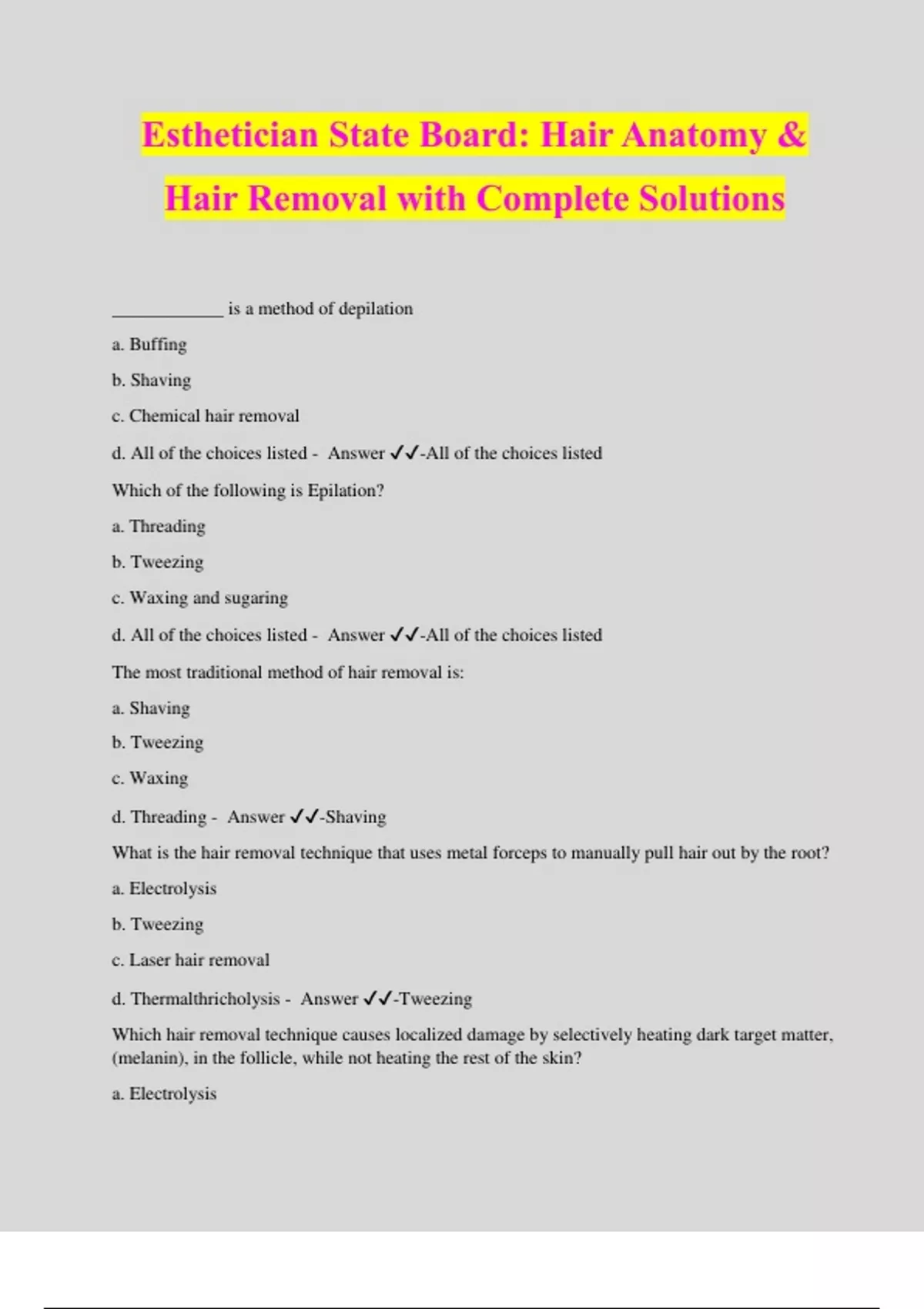 Esthetician State Board: Hair Anatomy & Hair Removal with Complete Solutions ____________ is a method of depilation a. Buffing b. Shaving c. Chemical hair removal d. All of the choices listed - Answer ️️ -All of the choices listed Which of the following is Epilation? a. Threading b. Tweezing c. Waxing and sugaring d. All of the choices listed - Answer ️️ -All of the choices listed The most traditional method of hair removal is: a. Shaving b. Tweezing c. Waxing d. Threading - Answer ️️ -Shaving What is the hair removal technique that uses metal forceps to manually pull hair out by the root? a. Electrolysis b. Tweezing c. Laser hair removal d. Thermalthricholysis - Answer ️️ -Tweezing Which hair removal technique causes localized damage by selectively heating dark target matter, (melanin), in the follicle, while not heating the rest of the skin? a. Electrolysis b. Waxing c. Laser hair removal d. Electric tweezing - Answer ️️ -Laser hair removal During this hair removal technique, a warm substance enters the follicle, allowing the hair to be pulled out from the root: a. Sugaring b. Thermal Threading c. Waxing d. Electrolysis - Answer ️️ -Waxing This hair removal technique uses low-level electricity and a very fine needle- shaped electrode or metal probe inserted into each hair follicle to kill, or render inactive, the hair follicles: a. Electrolysis b. Laser c. Waxing d. None of the choices listed - Answer ️️ -Electrolysis Which is NOT true regarding cosmetic hair removal? a. Ancient Egyptians practiced hair removal b. Hair removal can amount to as much as 50% of a salon‟s business c. Electrologists and medical doctors can perform electrolysis d. Unwanted hair growth only occurs in women - Answer ️️ -Unwanted hair growth only occurs in women Permanent hair removal necessitates the use of: a. Depilatories b. Electricity c. Wax d. Laser - Answer ️️ -Electricit