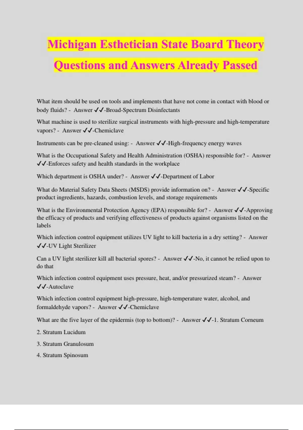 Michigan Esthetician State Board Theory Questions and Answers Already Passed What item should be used on tools and implements that have not come in contact with blood or body fluids? - Answer ️️ -Broad-Spectrum Disinfectants What machine is used to sterilize surgical instruments with high-pressure and high-temperature vapors? - Answer ️️ -Chemiclave Instruments can be pre-cleaned using: - Answer ️️ -High-frequency energy waves What is the Occupational Safety and Health Administration (OSHA) responsible for? - Answer ️️ -Enforces safety and health standards in the workplace Which department is OSHA under? - Answer ️️ -Department of Labor What do Material Safety Data Sheets (MSDS) provide information on? - Answer ️️ -Specific product ingredients, hazards, combustion levels, and storage requirements What is the Environmental Protection Agency (EPA) responsible for? - Answer ️️ -Approving the efficacy of products and verifying effectiveness of products against organisms listed on the labels Which infection control equipment utilizes UV light to kill bacteria in a dry setting? - Answer ️️ -UV Light Sterilizer Can a UV light sterilizer kill all bacterial spores? - Answer ️️ -No, it cannot be relied upon to do that Which infection control equipment uses pressure, heat, and/or pressurized steam? - Answer ️️ -Autoclave Which infection control equipment high-pressure, high-temperature water, alcohol, and formaldehyde vapors? - Answer ️️ -Chemiclave What are the five layer of the epidermis (top to bottom)? - Answer ️️ -1. Stratum Corneum 2. Stratum Lucidum 3. Stratum Granulosum 4. Stratum Spinosum