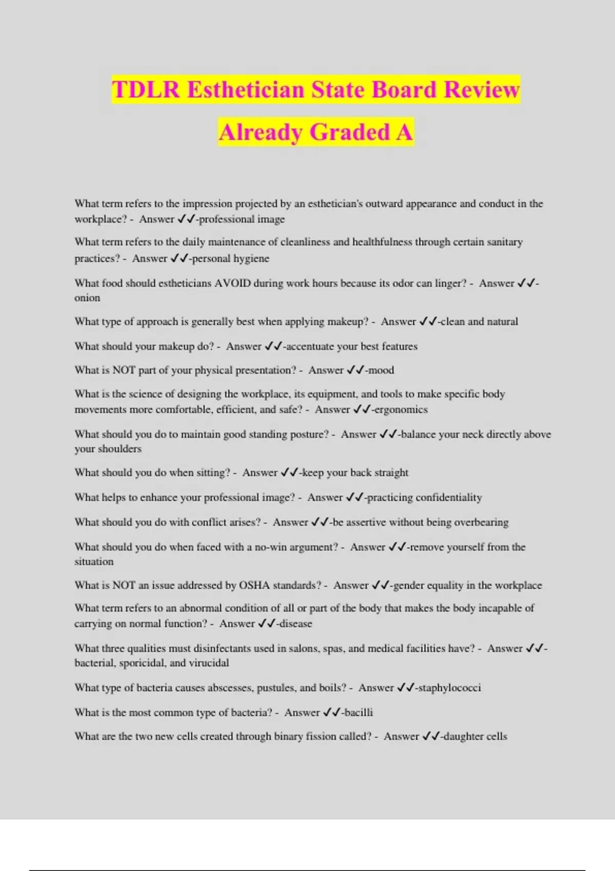 TDLR Esthetician State Board Review Already Graded A What term refers to the impression projected by an esthetician's outward appearance and conduct in the workplace? - Answer ️️ -professional image What term refers to the daily maintenance of cleanliness and healthfulness through certain sanitary practices? - Answer ️️ -personal hygiene What food should estheticians AVOID during work hours because its odor can linger? - Answer ️️ - onion What type of approach is generally best when applying makeup? - Answer ️️ -clean and natural What should your makeup do? - Answer ️️ -accentuate your best features What is NOT part of your physical presentation? - Answer ️️ -mood What is the science of designing the workplace, its equipment, and tools to make specific body movements more comfortable, efficient, and safe? - Answer ️️ -ergonomics What should you do to maintain good standing posture? - Answer ️️ -balance your neck directly above your shoulders What should you do when sitting? - Answer ️️ -keep your back straight What helps to enhance your professional image? - Answer ️️ -practicing confidentiality What should you do with conflict arises? - Answer ️️ -be assertive without being overbearing What should you do when faced with a no-win argument? - Answer ️️ -remove yourself from the situation What is NOT an issue addressed by OSHA standards? - Answer ️️ -gender equality in the workplace What term refers to an abnormal condition of all or part of the body that makes the body incapable of carrying on normal function? - Answer ️️ -disease What three qualities must disinfectants used in salons, spas, and medical facilities have? - Answer ️️ - bacterial, sporicidal, and virucidal What type of bacteria causes abscesses, pustules, and boils? - Answer ️️ -staphylococci What is the most common type of bacteria? - Answer ️️ -bacilli What are the two new cells created through binary fission called? - Answer ️️ -daughter cells