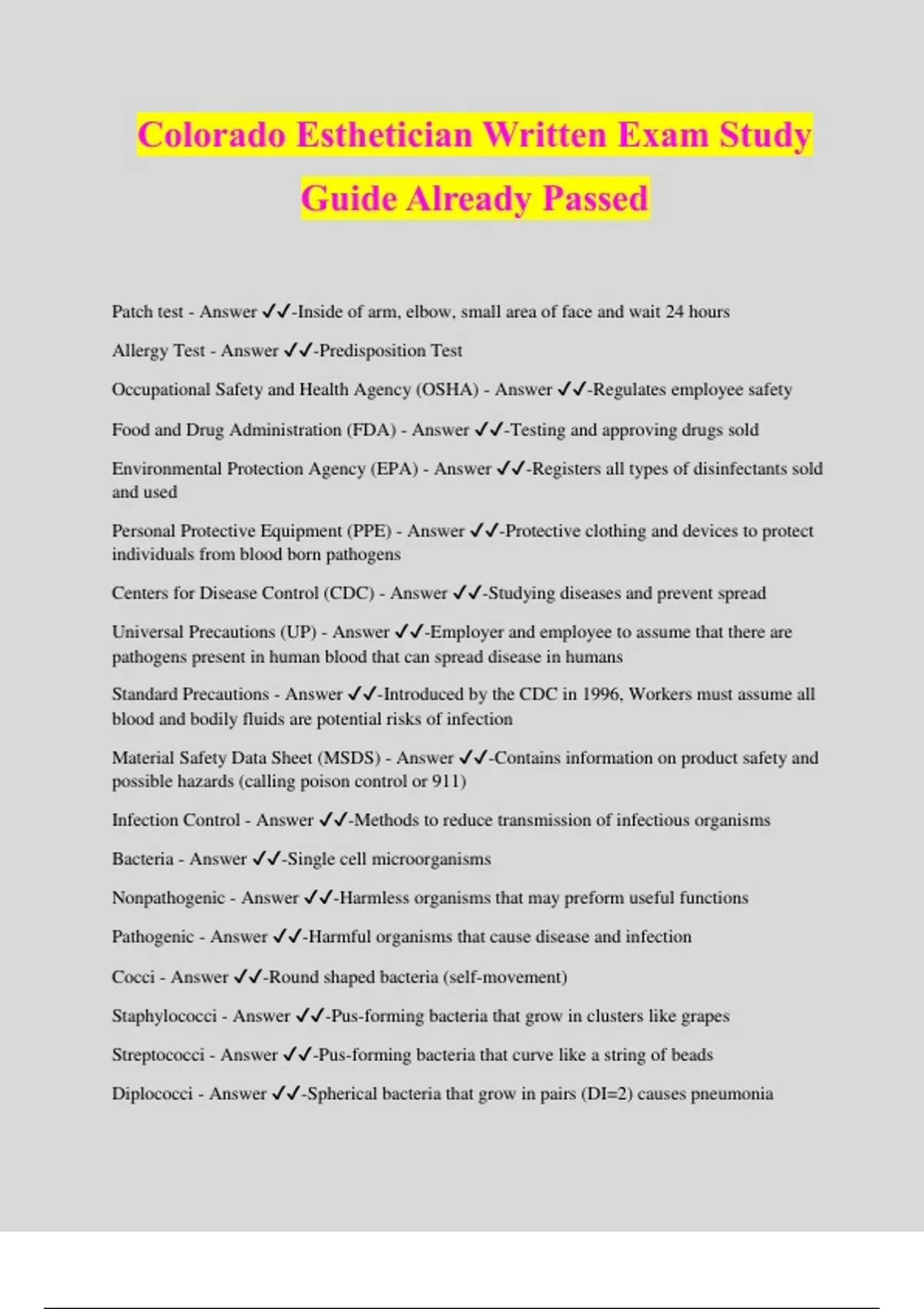 Colorado Esthetician Written Exam Study Guide Already Passed Patch test - Answer ️️ -Inside of arm, elbow, small area of face and wait 24 hours Allergy Test - Answer ️️ -Predisposition Test Occupational Safety and Health Agency (OSHA) - Answer ️️ -Regulates employee safety Food and Drug Administration (FDA) - Answer ️️ -Testing and approving drugs sold Environmental Protection Agency (EPA) - Answer ️️ -Registers all types of disinfectants sold and used Personal Protective Equipment (PPE) - Answer ️️ -Protective clothing and devices to protect individuals from blood born pathogens Centers for Disease Control (CDC) - Answer ️️ -Studying diseases and prevent spread Universal Precautions (UP) - Answer ️️ -Employer and employee to assume that there are pathogens present in human blood that can spread disease in humans Standard Precautions - Answer ️️ -Introduced by the CDC in 1996, Workers must assume all blood and bodily fluids are potential risks of infection Material Safety Data Sheet (MSDS) - Answer ️️ -Contains information on product safety and possible hazards (calling poison control or 911) Infection Control - Answer ️️ -Methods to reduce transmission of infectious organisms Bacteria - Answer ️️ -Single cell microorganisms Nonpathogenic - Answer ️️ -Harmless organisms that may preform useful functions Pathogenic - Answer ️️ -Harmful organisms that cause disease and infection Cocci - Answer ️️ -Round shaped bacteria (self-movement) Staphylococci - Answer ️️ -Pus-forming bacteria that grow in clusters like grapes Streptococci - Answer ️️ -Pus-forming bacteria that curve like a string of beads Diplococci - Answer ️️ -Spherical bacteria that grow in pairs (DI=2) causes pneumonia