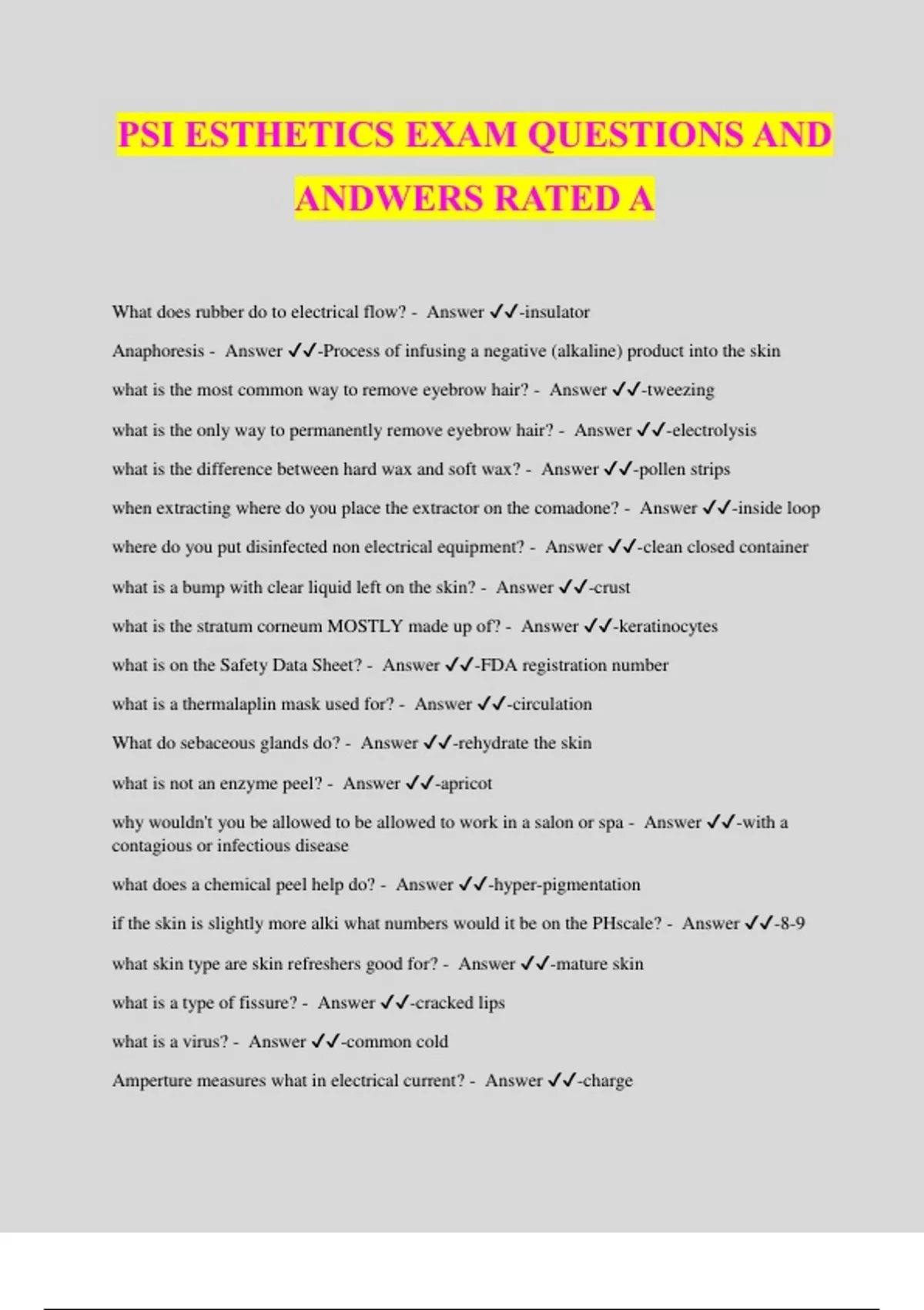 PSI ESTHETICS EXAM QUESTIONS AND ANDWERS RATED A What does rubber do to electrical flow? - Answer ️️ -insulator Anaphoresis - Answer ️️ -Process of infusing a negative (alkaline) product into the skin what is the most common way to remove eyebrow hair? - Answer ️️ -tweezing what is the only way to permanently remove eyebrow hair? - Answer ️️ -electrolysis what is the difference between hard wax and soft wax? - Answer ️️ -pollen strips when extracting where do you place the extractor on the comadone? - Answer ️️ -inside loop where do you put disinfected non electrical equipment? - Answer ️️ -clean closed container what is a bump with clear liquid left on the skin? - Answer ️️ -crust what is the stratum corneum MOSTLY made up of? - Answer ️️ -keratinocytes what is on the Safety Data Sheet? - Answer ️️ -FDA registration number what is a thermalaplin mask used for? - Answer ️️ -circulation What do sebaceous glands do? - Answer ️️ -rehydrate the skin what is not an enzyme peel? - Answer ️️ -apricot why wouldn't you be allowed to be allowed to work in a salon or spa - Answer ️️ -with a contagious or infectious disease what does a chemical peel help do? - Answer ️️ -hyper-pigmentation
