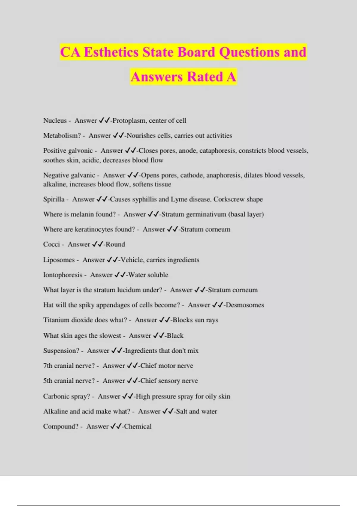 CA Esthetics State Board Questions and Answers Rated A Nucleus - Answer ️️ -Protoplasm, center of cell Metabolism? - Answer ️️ -Nourishes cells, carries out activities Positive galvonic - Answer ️️ -Closes pores, anode, cataphoresis, constricts blood vessels, soothes skin, acidic, decreases blood flow Negative galvanic - Answer ️️ -Opens pores, cathode, anaphoresis, dilates blood vessels, alkaline, increases blood flow, softens tissue Spirilla - Answer ️️ -Causes syphillis and Lyme disease. Corkscrew shape Where is melanin found? - Answer ️️ -Stratum germinativum (basal layer) Where are keratinocytes found? - Answer ️️ -Stratum corneum Cocci - Answer ️️ -Round Liposomes - Answer ️️ -Vehicle, carries ingredients Iontophoresis - Answer ️️ -Water soluble What layer is the stratum lucidum under? - Answer ️️ -Stratum corneum Hat will the spiky appendages of cells become? - Answer ️️ -Desmosomes Titanium dioxide does what? - Answer ️️ -Blocks sun rays What skin ages the slowest - Answer ️️ -Black Suspension? - Answer ️️ -Ingredients that don't mix 7th cranial nerve? - Answer ️️ -Chief motor nerve 5th cranial nerve? - Answer ️️ -Chief sensory nerve Carbonic spray? - Answer ️️ -High pressure spray for oily skin Alkaline and acid make what? - Answer ️️ -Salt and wate