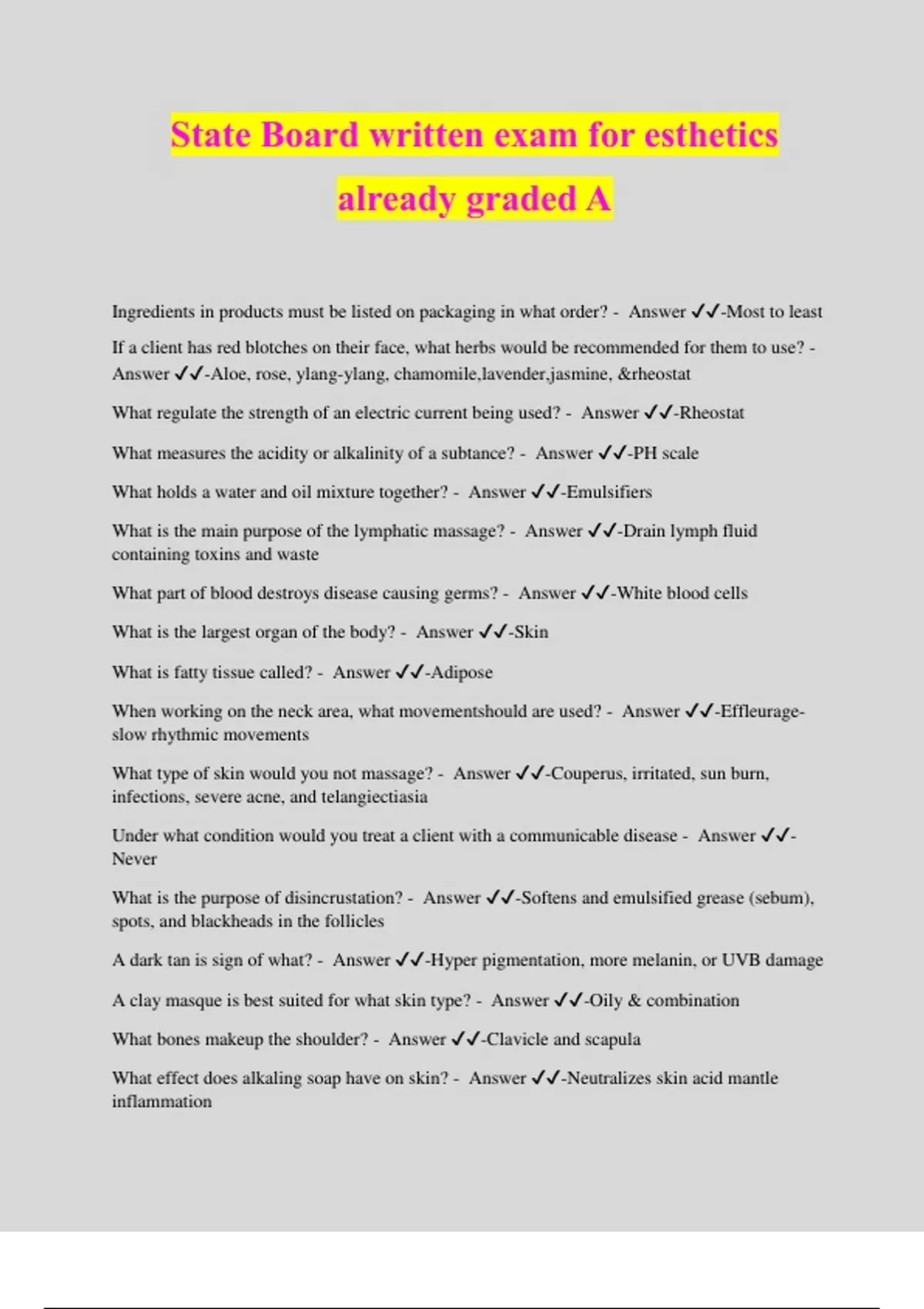 State Board written exam for esthetics already graded A Ingredients in products must be listed on packaging in what order? - Answer ️️ -Most to least If a client has red blotches on their face, what herbs would be recommended for them to use? - Answer ️️ -Aloe, rose, ylang-ylang, chamomile,lavender,jasmine, &rheostat What regulate the strength of an electric current being used? - Answer ️️ -Rheostat What measures the acidity or alkalinity of a subtance? - Answer ️️ -PH scale What holds a water and oil mixture together? - Answer ️️ -Emulsifiers What is the main purpose of the lymphatic massage? - Answer ️️ -Drain lymph fluid containing toxins and waste What part of blood destroys disease causing germs? - Answer ️️ -White blood cells What is the largest organ of the body? - Answer ️️ -Skin What is fatty tissue called? - Answer ️️ -Adipose When working on the neck area, what movementshould are used? - Answer ️️ -Effleurage- slow rhythmic movements What type of skin would you not massage? - Answer ️️ -Couperus, irritated, sun burn, infections, severe acne, and telangiectiasia Under what condition would you treat a client with a communicable disease - Answer ️️ - Never What is the purpose of disincrustation? - Answer ️️ -Softens and emulsified grease (sebum), spots, and blackheads in the follicles A dark tan is sign of what? - Answer ️️ -Hyper pigmentation, more melanin, or UVB damage A clay masque is best suited for what skin type? - Answer ️️ -Oily & combination What bones makeup the shoulder? - Answer ️️ -Clavicle and scapula What effect does alkaling soap have on skin? - Answer ️️ -Neutralizes skin acid mantle inflammation