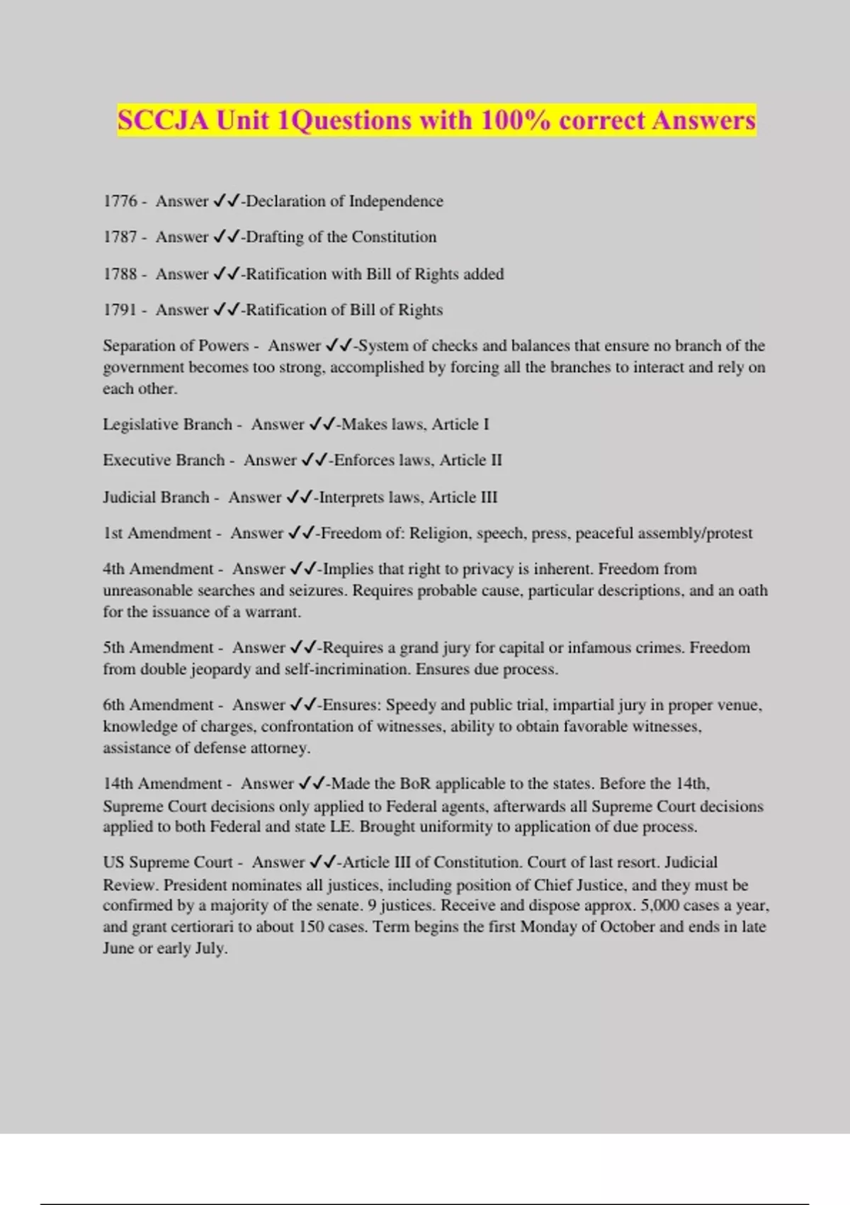 SCCJA Unit 1Questions with 100% correct Answers 1776 - Answer ️️ -Declaration of Independence 1787 - Answer ️️ -Drafting of the Constitution 1788 - Answer ️️ -Ratification with Bill of Rights added 1791 - Answer ️️ -Ratification of Bill of Rights Separation of Powers - Answer ️️ -System of checks and balances that ensure no branch of the government becomes too strong, accomplished by forcing all the branches to interact and rely on each other. Legislative Branch - Answer ️️ -Makes laws, Article I Executive Branch - Answer ️️ -Enforces laws, Article II Judicial Branch - Answer ️️ -Interprets laws, Article III 1st Amendment - Answer ️️ -Freedom of: Religion, speech, press, peaceful assembly/protest 4th Amendment - Answer ️️ -Implies that right to privacy is inherent. Freedom from unreasonable searches and seizures. Requires probable cause, particular descriptions, and an oath for the issuance of a warrant. 5th Amendment - Answer ️️ -Requires a grand jury for capital or infamous crimes. Freedom from double jeopardy and self-incrimination. Ensures due process. 6th Amendment - Answer ️️ -Ensures: Speedy and public trial, impartial jury in proper venue, knowledge of charges, confrontation of witnesses, ability to obtain favorable witnesses, assistance of defense attorney. 14th Amendment - Answer ️️ -Made the BoR applicable to the states. Before the 14th, Supreme Court decisions only applied to Federal agents, afterwards all Supreme Court decisions applied to both Federal and state LE. Brought uniformity to application of due process. US Supreme Court - Answer ️️ -Article III of Constitution. Court of last resort. Judicial Review. President nominates all justices, including position of Chief Justice, and they must be confirmed by a majority of the senate. 9 justices. Receive and dispose approx. 5,000 cases a year, and grant certiorari to about 150 cases. Term begins the first Monday of October and ends in late June or early July.