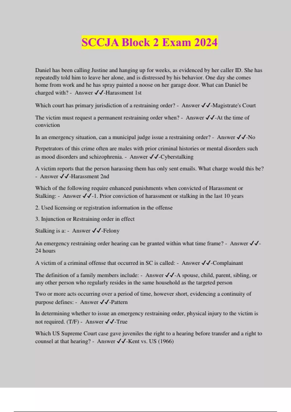 SCCJA Block 2 Exam 2024 Daniel has been calling Justine and hanging up for weeks, as evidenced by her caller ID. She has repeatedly told him to leave her alone, and is distressed by his behavior. One day she comes home from work and he has spray painted a noose on her garage door. What can Daniel be charged with? - Answer ️️ -Harassment 1st Which court has primary jurisdiction of a restraining order? - Answer ️️ -Magistrate's Court The victim must request a permanent restraining order when? - Answer ️️ -At the time of conviction In an emergency situation, can a municipal judge issue a restraining order? - Answer ️️ -No Perpetrators of this crime often are males with prior criminal histories or mental disorders such as mood disorders and schizophrenia. - Answer ️️ -Cyberstalking A victim reports that the person harassing them has only sent emails. What charge would this be? - Answer ️️ -Harassment 2nd Which of the following require enhanced punishments when convicted of Harassment or Stalking: - Answer ️️ -1. Prior conviction of harassment or stalking in the last 10 years 2. Used licensing or registration information in the offense 3. Injunction or Restraining order in effect Stalking is a: - Answer ️️ -Felony An emergency restraining order hearing can be granted within what time frame? - Answer ️️ - 24 hours A victim of a criminal offense that occurred in SC is called: - Answer ️️ -Complainant The definition of a family members include: - Answer ️️ -A spouse, child, parent, sibling, or any other person who regularly resides in the same household as the targeted person Two or more acts occurring over a period of time, however short, evidencing a continuity of purpose defines: - Answer ️️ -Pattern In determining whether to issue an emergency restraining order, physical injury to the victim is not required. (T/F) - Answer ️️ -True Which US Supreme Court case gave juveniles the right to a hearing before transfer and a right to counsel at that hearing? - Answer ️️ -Kent vs. US (1966