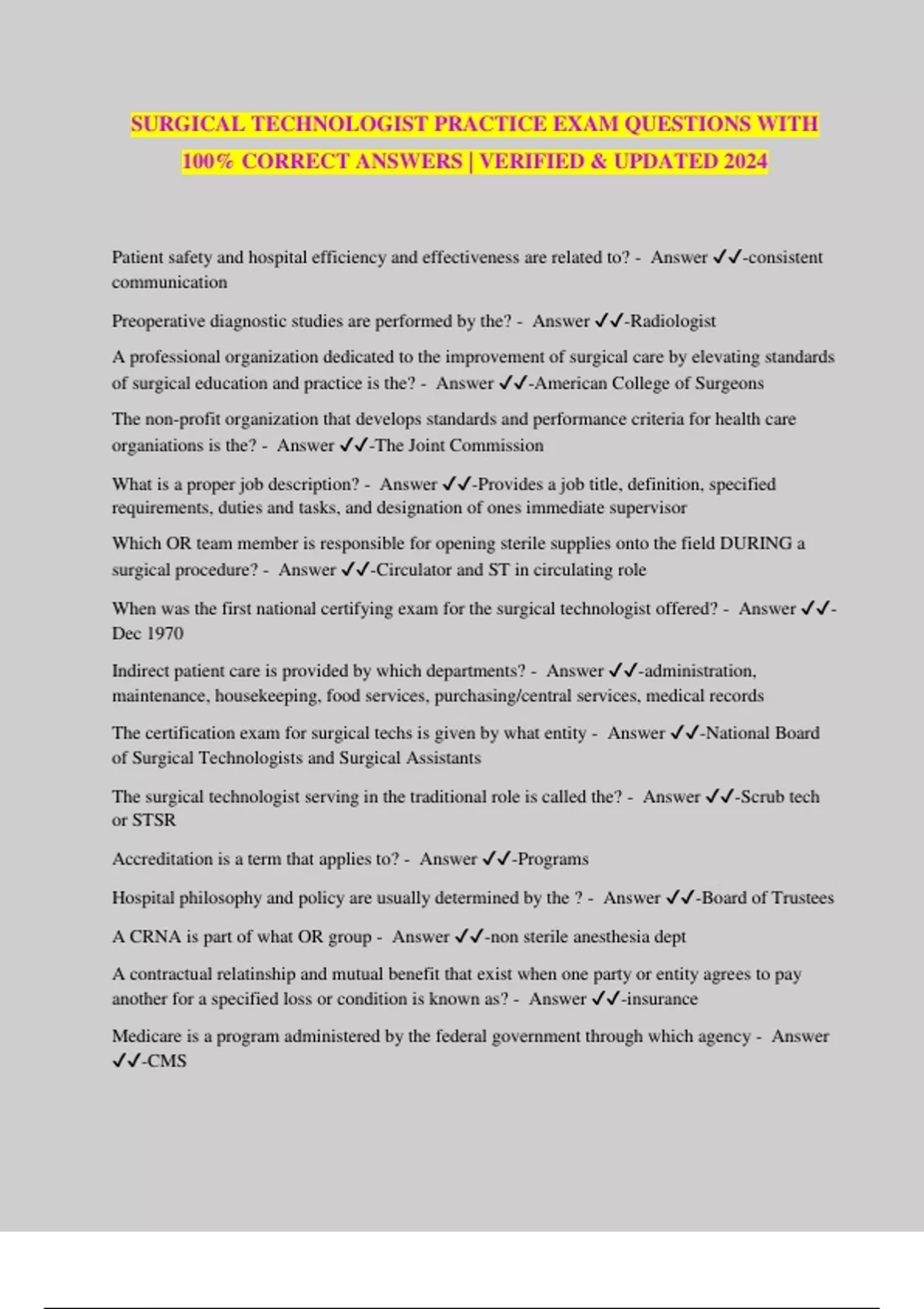 SURGICAL TECHNOLOGIST PRACTICE EXAM QUESTIONS WITH 100% CORRECT ANSWERS | VERIFIED & UPDATED 2024 Patient safety and hospital efficiency and effectiveness are related to? - Answer ️️ -consistent communication Preoperative diagnostic studies are performed by the? - Answer ️️ -Radiologist A professional organization dedicated to the improvement of surgical care by elevating standards of surgical education and practice is the? - Answer ️️ -American College of Surgeons The non-profit organization that develops standards and performance criteria for health care organiations is the? - Answer ️️ -The Joint Commission What is a proper job description? - Answer ️️ -Provides a job title, definition, specified requirements, duties and tasks, and designation of ones immediate supervisor Which OR team member is responsible for opening sterile supplies onto the field DURING a surgical procedure? - Answer ️️ -Circulator and ST in circulating role When was the first national certifying exam for the surgical technologist offered? - Answer ️️ - Dec 1970 Indirect patient care is provided by which departments? - Answer ️️ -administration, maintenance, housekeeping, food services, purchasing/central services, medical records The certification exam for surgical techs is given by what entity - Answer ️️ -National Board of Surgical Technologists and Surgical Assistants The surgical technologist serving in the traditional role is called the? - Answer ️️ -Scrub tech or STSR Accreditation is a term that applies to? - Answer ️️ -Programs Hospital philosophy and policy are usually determined by the ? - Answer ️️ -Board of Trustees A CRNA is part of what OR group - Answer ️️ -non sterile anesthesia dept A contractual relatinship and mutual benefit that exist when one party or entity agrees to pay another for a specified loss or condition is known as? - Answer ️️ -insurance Medicare is a program administered by the federal government through which agency - Answer ️️ -CMS The __ is a division of the United Nations that promotes health activites worldwide? - Answer ️️ -World Health Organization What entity accredits surgical technology programs? - Answer ️️ -Commission Accreditation of Allied Health Education Programs A general description of the abilities needed to perform a job is known as? - Answer ️️ - competencies What term defines the relationship among coworker, surgeon, and other health care providers? - Answer ️️ -professional What term defines the relationship among the surgical technologist, the patient, and the patient's family? - Answer ️️ -therapeutic According to the text, what is key to teamwork among health care providers? - Answer ️️ - communication A hospital that is owned by an individual or corporation in order to make a profit is known as which type of hospital? - Answer ️️ -Proprietary What program allows for a surgical technologist to ascend to positions of increased responsibility - Answer ️️ -Clinical Ladder What organization acts both as an insurer and a provider of medical services - Answer ️️ - Health Maintenance Organization What health care organization requires a primary care physician for all referrals? - Answer ️️ - HMO What hospital committee verifies the credentials of the physicians and specialized health care personnel - Answer ️️ -Medical Staff Committee What department provides sterotactic services? - Answer ️️ -Diagnostic Imaging What department identifies patient hazards and develops solutions? - Answer ️️ -Risk Management What department provides preventive measures against infection? - Answer ️️ -Infection control What department repairs broken equipment? - Answer ️️ -Maintenance/Biom