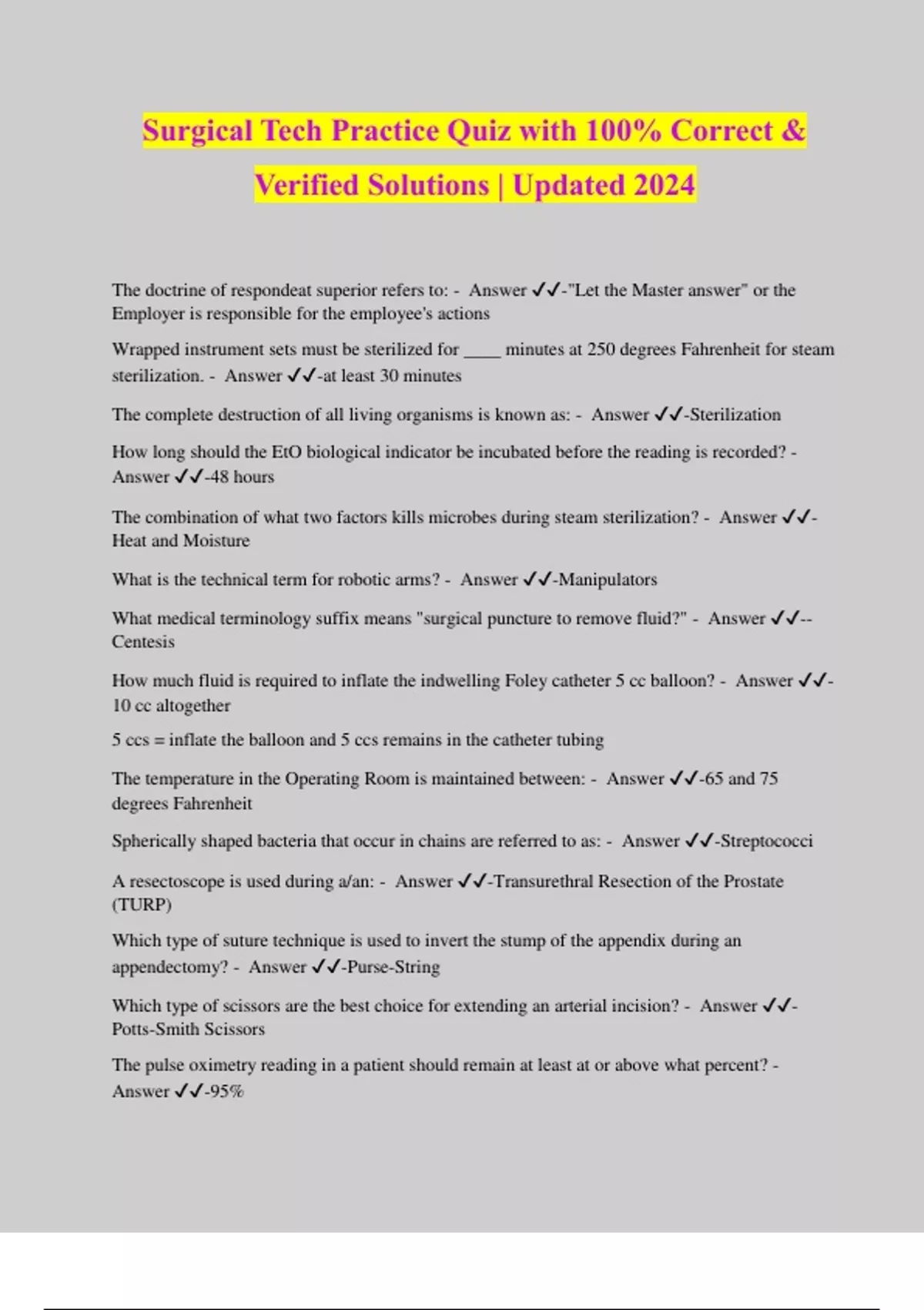 Surgical Tech Practice Quiz with 100% Correct & Verified Solutions | Updated 2024 The doctrine of respondeat superior refers to: - Answer ️️ -"Let the Master answer" or the Employer is responsible for the employee's actions Wrapped instrument sets must be sterilized for ____ minutes at 250 degrees Fahrenheit for steam sterilization. - Answer ️️ -at least 30 minutes The complete destruction of all living organisms is known as: - Answer ️️ -Sterilization How long should the EtO biological indicator be incubated before the reading is recorded? - Answer ️️ -48 hours The combination of what two factors kills microbes during steam sterilization? - Answer ️️ - Heat and Moisture What is the technical term for robotic arms? - Answer ️️ -Manipulators What medical terminology suffix means "surgical puncture to remove fluid?" - Answer ️️ -- Centesis How much fluid is required to inflate the indwelling Foley catheter 5 cc balloon? - Answer ️️ - 10 cc altogether