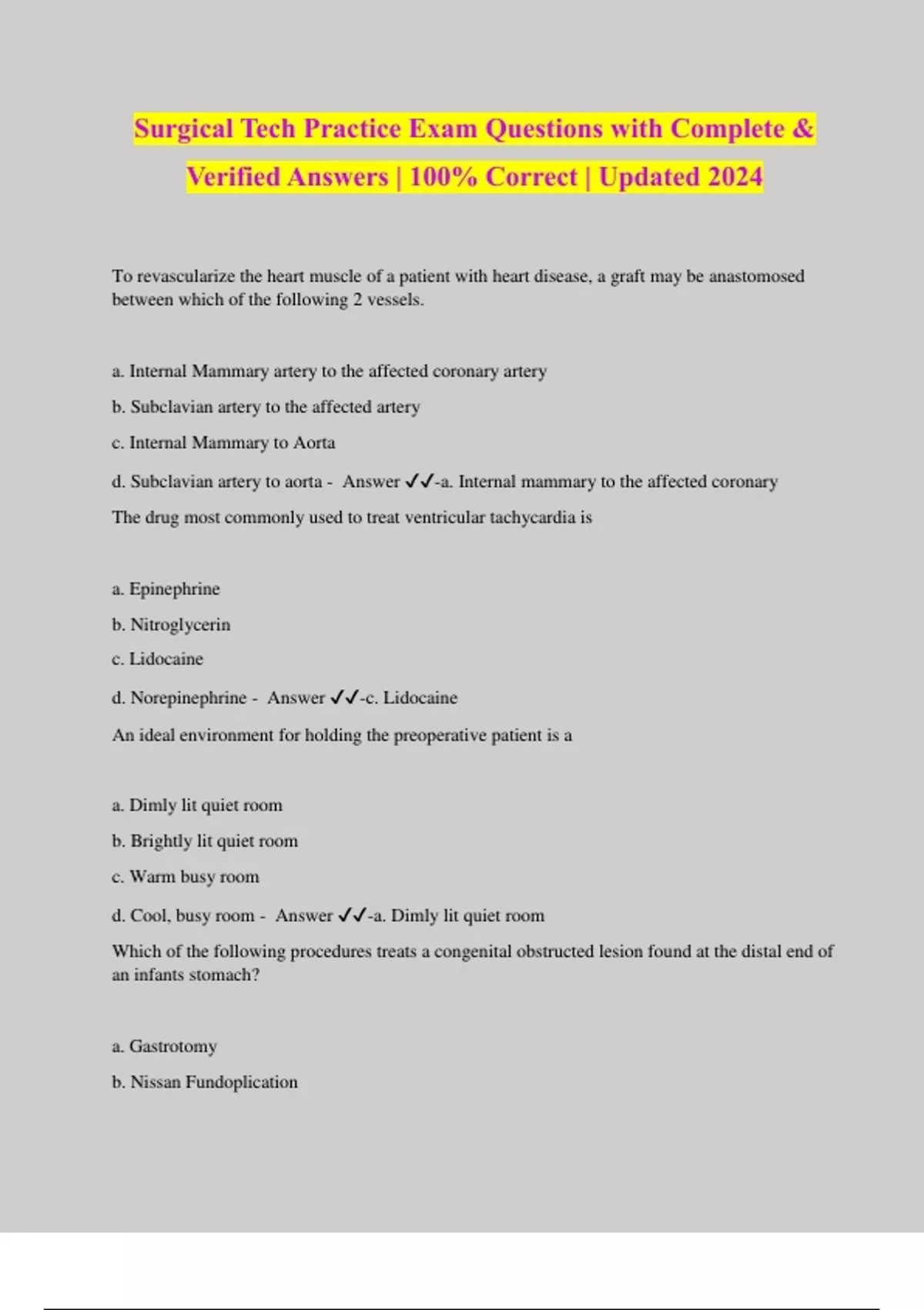 Surgical Tech Practice Exam Questions with Complete & Verified Answers | 100% Correct | Updated 2024 To revascularize the heart muscle of a patient with heart disease, a graft may be anastomosed between which of the following 2 vessels. a. Internal Mammary artery to the affected coronary artery b. Subclavian artery to the affected artery c. Internal Mammary to Aorta d. Subclavian artery to aorta - Answer ️️ -a. Internal mammary to the affected coronary The drug most commonly used to treat ventricular tachycardia is a. Epinephrine b. Nitroglycerin c. Lidocaine d. Norepinephrine - Answer ️️ -c. Lidocaine An ideal environment for holding the preoperative patient is a a. Dimly lit quiet room b. Brightly lit quiet room c. Warm busy room d. Cool, busy room - Answer ️️ -a. Dimly lit quiet room Which of the following procedures treats a congenital obstructed lesion found at the distal end of an infants stomach? a. Gastrotomy b. Nissan Fundoplication C. Heller Myotomy D. Pyloromyotmy - Answer ️️ -d. Pyloromyotomy A cardiac arrest occurs during a procedure, the surgeon is resuscitation the patient. What is the responsibility of the surgical tech in the scrub role during this time? a. Hand the dr. a loaded needle holder and forceps for closing b. Break scrub and call for help c. Remain sterile and maintain the sterile field d. Move the electrosurgical unit away from the operating table - Answer ️️ -c. Remain sterile and maintain the field Which of the following is the definition of instrument sterilization? a. surgical cleaning with an antiseptic b. manual decontamination c. Destruction of microorganisms d. Reduction of bacteria - Answer ️️ -c. Destruction of microorganisms A preference card indicates a surgeon prefers a large paper gown and size 7.5 gloves and the assistant prefers an xl gown and size 8 gloves. The assistant usually scrubs first, in which order should the surgical attire be stacked from top to bottom? a. towel,, xl gown, 7.5 gloves, towel, large gown, size 8 gloves b. size 7.5 gloves, xl gown, towel, size 8 gloves, large gown, size 7.5 gloves c. towel, xl gown, size 8 gloves, towel large gowns, size 7.5 gown - Answer ️️ -c. Which of the following types of anesthetic is injected during a beir block? a. Marcaine b. Lidocaine with epi c. Marcaine with epi d. Lidocaine - Answer ️️ -d. Lidocai