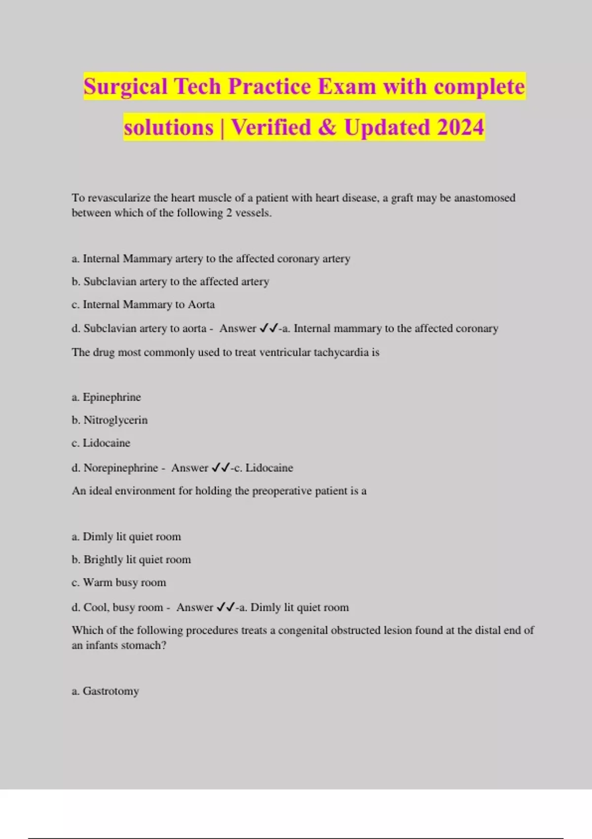 Surgical Tech Practice Exam with complete solutions | Verified & Updated 2024 To revascularize the heart muscle of a patient with heart disease, a graft may be anastomosed between which of the following 2 vessels. a. Internal Mammary artery to the affected coronary artery b. Subclavian artery to the affected artery c. Internal Mammary to Aorta d. Subclavian artery to aorta - Answer ️️ -a. Internal mammary to the affected coronary The drug most commonly used to treat ventricular tachycardia is a. Epinephrine b. Nitroglycerin c. Lidocaine d. Norepinephrine - Answer ️️ -c. Lidocaine An ideal environment for holding the preoperative patient is a a. Dimly lit quiet room b. Brightly lit quiet room c. Warm busy room d. Cool, busy room - Answer ️️ -a. Dimly lit quiet room Which of the following procedures treats a congenital obstructed lesion found at the distal end of an infants stomach? a. Gastrotomy b. Nissan Fundoplication C. Heller Myotomy D. Pyloromyotmy - Answer ️️ -d. Pyloromyotomy A cardiac arrest occurs during a procedure, the surgeon is resuscitation the patient. What is the responsibility of the surgical tech in the scrub role during this time? a. Hand the dr. a loaded needle holder and forceps for closing b. Break scrub and call for help c. Remain sterile and maintain the sterile field d. Move the electrosurgical unit away from the operating table - Answer ️️ -c. Remain sterile and maintain the field Which of the following is the definition of instrument sterilization? a. surgical cleaning with an antiseptic b. manual decontamination c. Destruction of microorganisms d. Reduction of bacteria - Answer ️️ -c. Destruction of microorganisms A preference card indicates a surgeon prefers a large paper gown and size 7.5 gloves and the assistant prefers an xl gown and size 8 gloves. The assistant usually scrubs first, in which order should the surgical attire be stacked from top to bottom? a. towel,, xl gown, 7.5 gloves, towel, large gown, size 8 gloves b. size 7.5 gloves, xl gown, towel, size 8 gloves, large gown, size 7.5 gloves c. towel, xl gown, size 8 gloves, towel large gowns, size 7.5 gown - Answer ️️ -c. Which of the following types of anesthetic is injected during a beir block? a. Marcaine b. Lidocaine with epi c. Marcaine with epi d. Lidocaine - Answer ️️ -d. Lidocaine Aerobic organisms are BEST characterized as a. Pathogenic b. Nonpathogenic c. Oxygen requiring b. Non-oxygen requiring - Answer ️️ -c. Oxygen requiring When positioning the patient in lithotomy position, the stirrups height should be adjusted according to the a. height of the first assistant b. manufacturer's recommendations c. Height of the surgeon d. Length of the patients legs - Answer ️️ -d. Length of the pt's legs Which of the following is applied as a nonadherent dressing? a. Adaptic b. Collodion C. Steri-strips - Answer ️️ -a. Adaptic Which of the following conditions triggered by an injection of succinylcholine and causes an unusually high fever? a. Osteomyelitis b. Sepsis c. Malignant hyperthermia d. Appendicitis - Answer ️️ -c. Malignant myperthermia When performing a dilation and curettage, which of the following instruments is used to grasp the cervix? a. Sims b. Auvard c. Schroeder d. Bozeman - Answer ️️ -c. Schroeder The sterrad sterilization system MOST commonly uses which of the following chemical solutions? a. Hydrogen peroxide b. gluteraldehyde c. Peracetic acid d. carbon dioxide - Answer ️️ -a. hydrogen peroxide Which of the following should be visualized on a xray to determine if a long bone is still growing? a. periosteum b. diaphysis c. medullary canal d. epiphyseal plate - Answer ️️ -d. epiphyseal pla