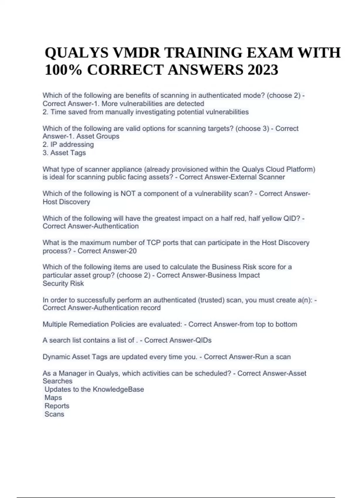 QUALYS VMDR TRAINING EXAM WITH 100% CORRECT ANSWERS 2023. Which of the following are benefits of scanning in authenticated mode? (choose 2) - Correct Answer-1. More vulnerabilities are detected 2. Time saved from manually investigating potential vulnerabilities Which of the following are valid options for scanning targets? (choose 3) - Correct Answer-1. Asset Groups 2. IP addressing 3. Asset Tags What type of scanner appliance (already provisioned within the Qualys Cloud Platform) is ideal for scanning public facing assets? - Correct Answer-External Scanner Which of the following is NOT a component of a vulnerability scan? - Correct AnswerHost Discovery Which of the following will have the greatest impact on a half red, half yellow QID? - Correct Answer-Authentication What is the maximum number of TCP ports that can participate in the Host Discovery process? - Correct Answer-20 Which of the following items are used to calculate the Business Risk score for a particular asset group? (choose 2) - Correct Answer-Business Impact Security Risk In order to successfully perform an authenticated (trusted) scan, you must create a(n): - Correct Answer-Authentication record Multiple Remediation Policies are evaluated: - Correct Answer-from top to bottom A search list contains a list of . - Correct Answer-QIDs Dynamic Asset Tags are updated every time you. - Correct Answer-Run a scan .