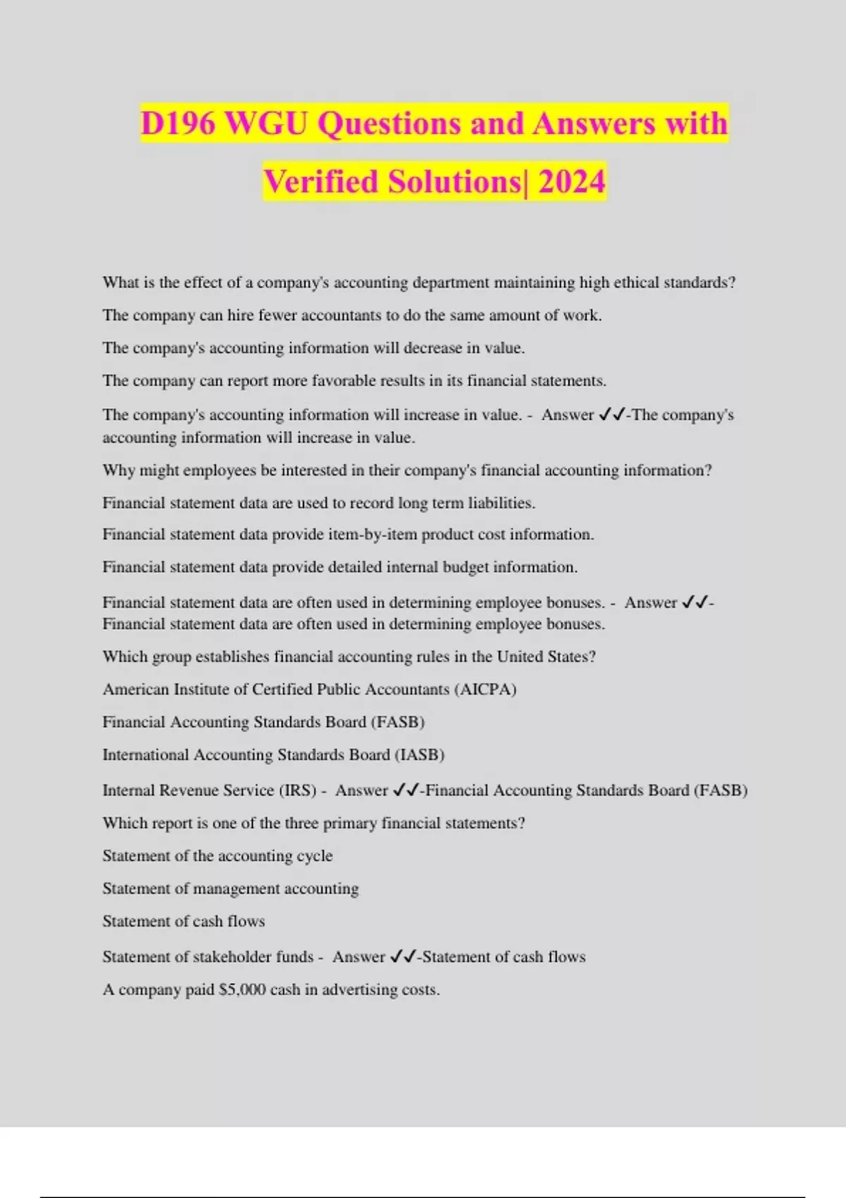 D196 WGU Questions and Answers with Verified Solutions| 2024 What is the effect of a company's accounting department maintaining high ethical standards? The company can hire fewer accountants to do the same amount of work. The company's accounting information will decrease in value. The company can report more favorable results in its financial statements. The company's accounting information will increase in value. - Answer ️️ -The company's accounting information will increase in value. Why might employees be interested in their company's financial accounting information? Financial statement data are used to record long term liabilities. Financial statement data provide item-by-item product cost information. Financial statement data provide detailed internal budget information. Financial statement data are often used in determining employee bonuses. - Answer ️️ - Financial statement data are often used in determining employee bonuses. Which group establishes financial accounting rules in the United States? American Institute of Certified Public Accountants (AICPA) Financial Accounting Standards Board (FASB) International Accounting Standards Board (IASB) Internal Revenue Service (IRS) - Answer ️️ -Financial Accounting Standards Board (FASB) Which report is one of the three primary financial statements? Statement of the accounting cycle Statement of management accounting Statement of cash flows Statement of stakeholder funds - Answer ️️ -Statement of cash flows A company paid $5,000 cash in advertising costs