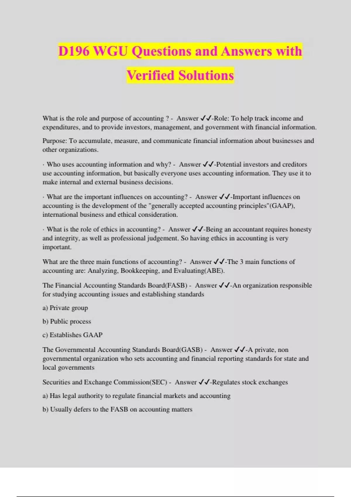 D196 WGU Questions and Answers with Verified Solutions What is the role and purpose of accounting ? - Answer ️️ -Role: To help track income and expenditures, and to provide investors, management, and government with financial information. Purpose: To accumulate, measure, and communicate financial information about businesses and other organizations. · Who uses accounting information and why? - Answer ️️ -Potential investors and creditors use accounting information, but basically everyone uses accounting information. They use it to make internal and external business decisions. · What are the important influences on accounting? - Answer ️️ -Important influences on accounting is the development of the "generally accepted accounting principles"(GAAP), international business and ethical consideration. · What is the role of ethics in accounting? - Answer ️️ -Being an accountant requires honesty and integrity, as well as professional judgement. So having ethics in accounting is very important. What are the three main functions of accounting? - Answer ️️ -The 3 main functions of accounting are: Analyzing, Bookkeeping, and Evaluating(ABE). The Financial Accounting Standards Board(FASB) - Answer ️️ -An organization responsible for studying accounting issues and establishing standards a) Private group b) Public process c) Establishes GAAP The Governmental Accounting Standards Board(GASB) - Answer ️️ -A private, non governmental organization who sets accounting and financial reporting standards for state and local governments Securities and Exchange Commission(SEC) - Answer ️️ -Regulates stock exchanges a) Has legal authority to regulate financial markets and accounting b) Usually defers to the FASB on accounting matters The Public Company Accounting Oversight Board(PCAOB) - Answer ️️ -Oversees all accounting firms. Internal Revenue Service(IRS) - Answer ️️ -Collects and regulates income taxes International Accounting Standards Board(IASB) - Answer ️️ -The FASB of the world(except the USA) Assets - Answer ️️ -assets are what we OWN. Common Assets: -) Cash -) Accounts receivable -) Inventory -) Buildings -) Prepaid Liabilities - Answer ️️ -An obligation to pay cash, transfer other assets, or provide services to someone. A) Liabilities are what we OWE. B) Common Liabilities: -) Accounts Payable -) Taxes Payable -) Mortgage Payable -) Unearned Revenue Owners Equity - Answer ️️ -The owners share of earnings. A) Sources of equity: -) Capital/Common Stock -) Retained Earnings What is the Accounting Cycle and how does it work? - Answer ️️ -The accounting cycle is the procedure for analyzing, recording, summarizing, and preparing the transactions of a business. The accounting cycle works by turning transactions into financial statements through these steps: Step 1: Analyze Transactions Step 2: Record the effects of trans