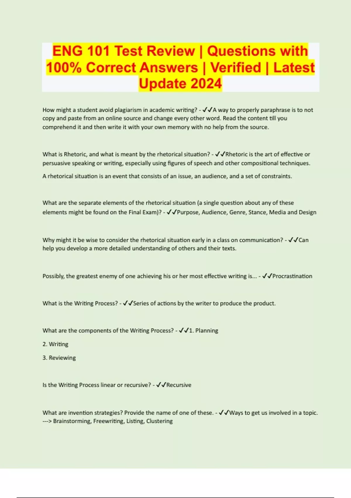 ENG 101 Test Review | Questions with 100% Correct Answers | Verified | Latest Update 2024