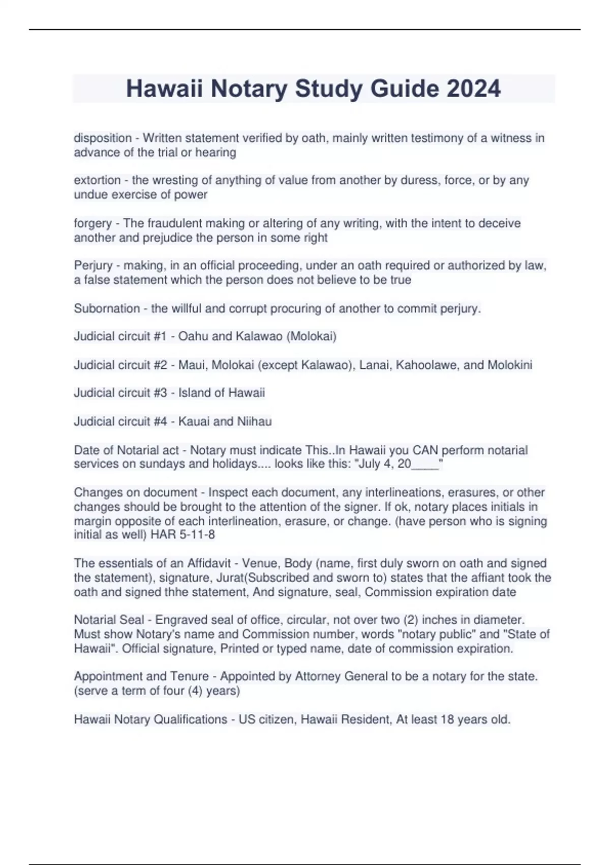disposition - Written statement verified by oath, mainly written testimony of a witness in advance of the trial or hearing extortion - the wresting of anything of value from another by duress, force, or by any undue exercise of power forgery - The fraudulent making or altering of any writing, with the intent to deceive another and prejudice the person in some right Perjury - making, in an official proceeding, under an oath required or authorized by law, a false statement which the person does not believe to be true Subornation - the willful and corrupt procuring of another to commit perjury. Judicial circuit #1 - Oahu and Kalawao (Molokai) Judicial circuit #2 - Maui, Molokai (except Kalawao), Lanai, Kahoolawe, and Molokini Judicial circuit #3 - Island of Hawaii Judicial circuit #4 - Kauai and Niihau Date of Notarial act - Notary must indicate This..In Hawaii you CAN perform notarial services on sundays and holidays.... looks like this: "July 4, 20____" Changes on document - Inspect each document, any interlineations, erasures, or other changes should be brought to the attention of the signer. If ok, notary places initials in margin opposite of each interlineation, erasure, or change. (have person who is signing initial as well) HAR 5-11-8 The essentials of an Affidavit - Venue, Body (name, first duly sworn on oath and signed the statement), signature, Jurat(Subscribed and sworn to) states that the affiant took the oath and signed thhe statement, And signature, seal, Commission expiration date Notarial Seal - Engraved seal of office, circular, not over two (2) inches in diameter. Must show Notary's name and Commission number, words "notary public" and "State of Hawaii". Official signature, Printed or typed name, date of commission expiration. Appointment and Tenure - Appointed by Attorney General to be a notary for the state. (serve a term of four (4) years) Hawaii Notary Qualifications - US citizen, Hawaii Resident, At least 18 years old.