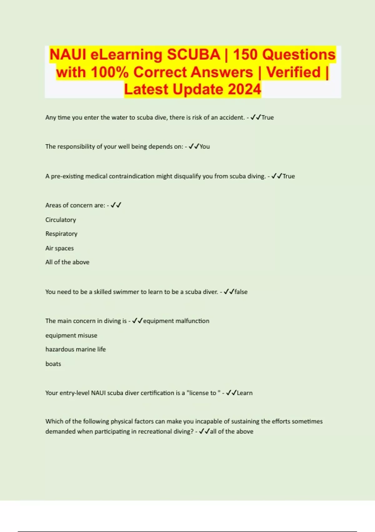 NAUI eLearning SCUBA | 150 Questions with 100% Correct Answers | Verified | Latest Update 2024