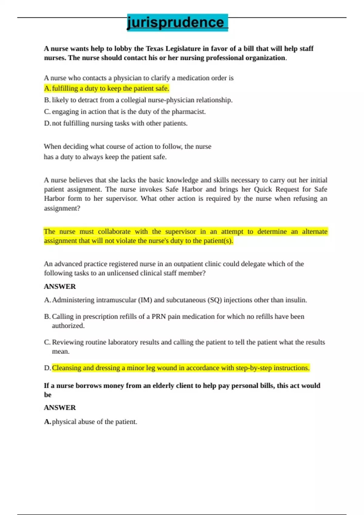 A nurse who contacts a physician to clarify a medication order is A.fulfilling a duty to keep the patient safe. B. likely to detract from a collegial nurse-physician relationship. C. engaging in action that is the duty of the pharmacist. D.not fulfilling nursing tasks with other patients. When deciding what course of action to follow, the nurse has a duty to always keep the patient safe. A nurse believes that she lacks the basic knowledge and skills necessary to carry out her initial patient assignment. The nurse invokes Safe Harbor and brings her Quick Request for Safe Harbor form to her supervisor. What other action is required by the nurse when refusing an assignment? The nurse must collaborate with the supervisor in an attempt to determine an alternate assignment that will not violate the nurse's duty to the patient(s). An advanced practice registered nurse in an outpatient clinic could delegate which of the following tasks to an unlicensed clinical staff member? ANSWER A.Administering intramuscular (IM) and subcutaneous (SQ) injections other than insulin. B.Calling in prescription refills of a PRN pain medication for which no refills have been authorized. C.Reviewing routine laboratory results and calling the patient to tell the patient what the results mean. D.Cleansing and dressing a minor leg wound in accordance with step-by-step instructions. If a nurse borrows money from an elderly client to help pay personal bills, this act would be ANSWER A.physical abuse of the patient