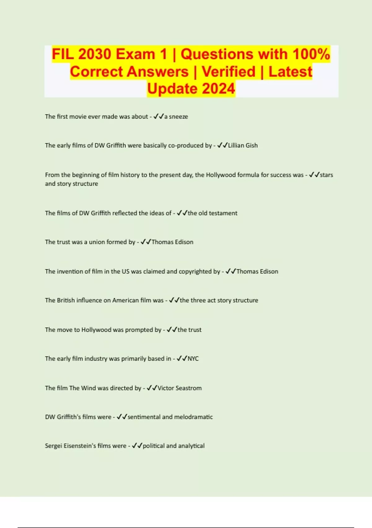 The first movie ever made was about - a sneeze The early films of DW Griffith were basically co-produced by - Lillian Gish From the beginning of film history to the present day, the Hollywood formula for success was - stars and story structure The films of DW Griffith reflected the ideas of - the old testament The trust was a union formed by - Thomas Edison The invention of film in the US was claimed and copyrighted by - Thomas Edison The British influence on American film was - the three act story structure The move to Hollywood was prompted by - the trust The early film industry was primarily based in - NYC