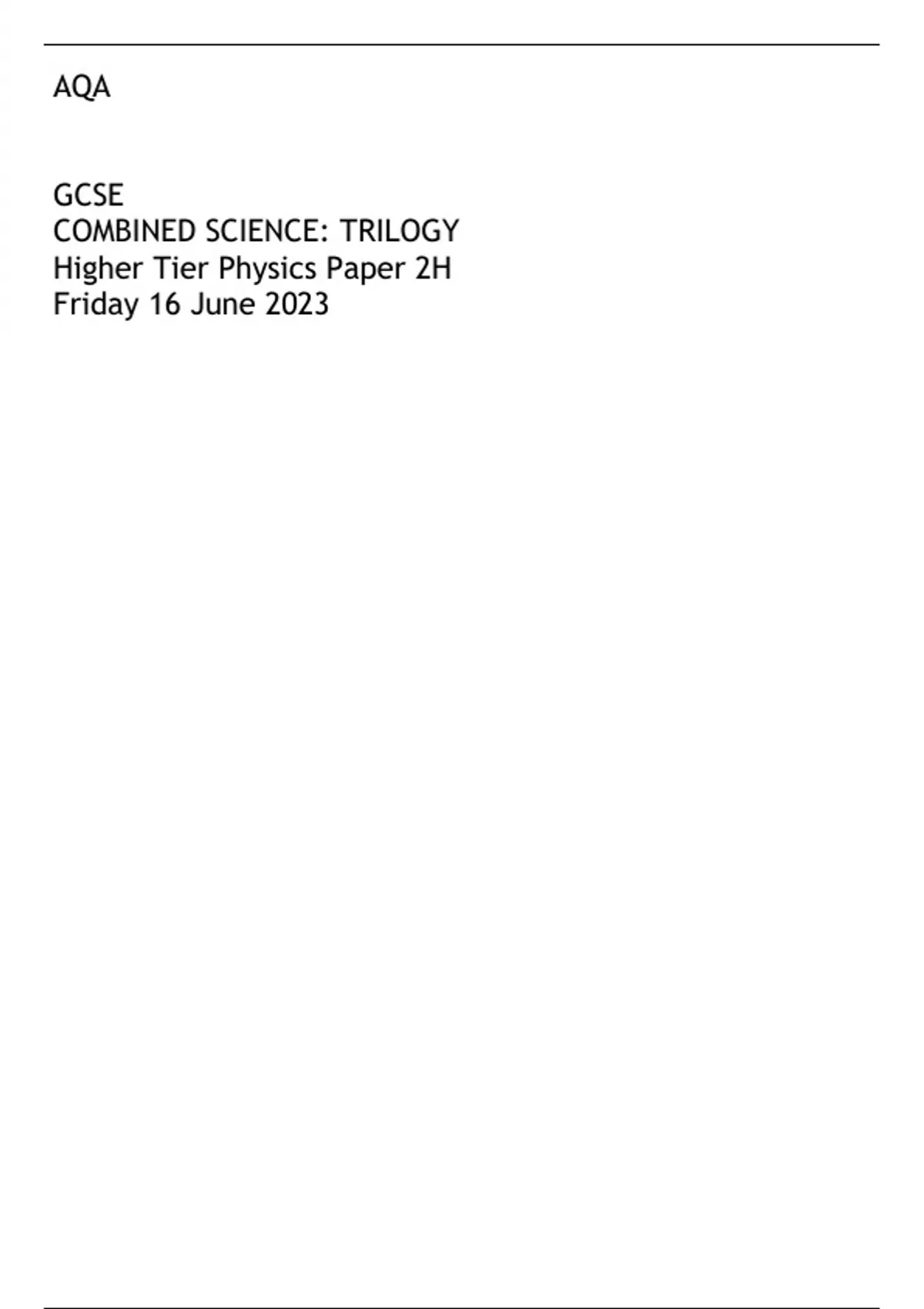 AQA GCSE COMBINED SCIENCE: TRILOGY Higher Tier Physics Paper 2H Friday 16 June 2023