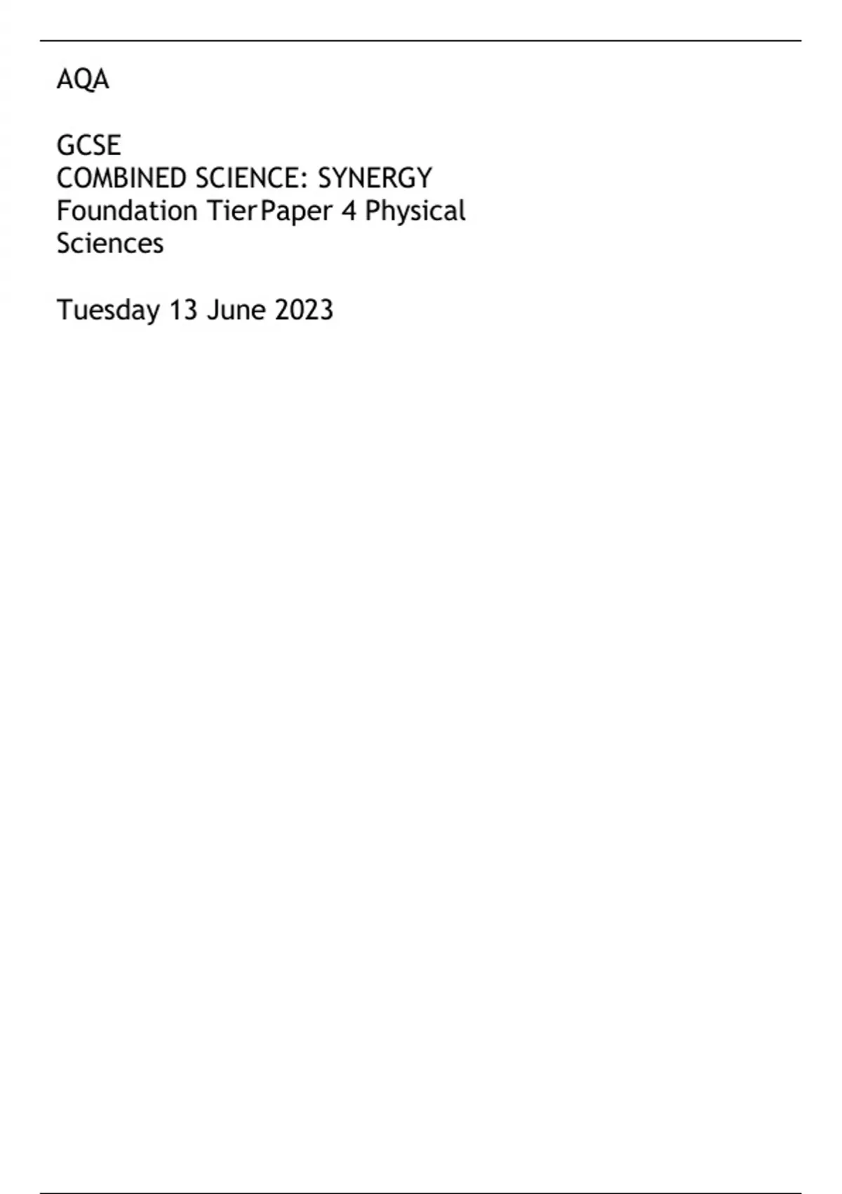 AQA GCSE COMBINED SCIENCE: SYNERGY Foundation Tier Paper 4 Physical Sciences Tuesday 13 June 2023