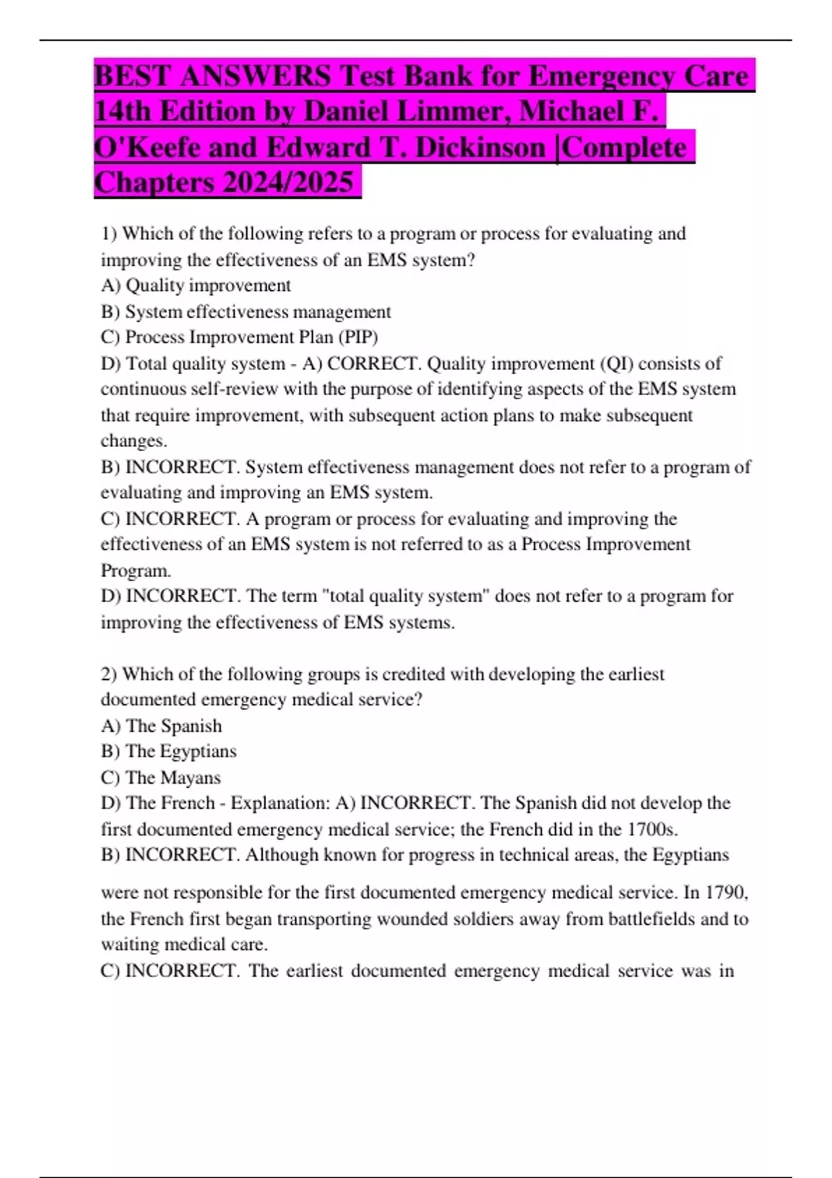 BEST ANSWERS Test Bank for Emergency Care 14th Edition by Daniel Limmer, Michael F. O'Keefe and Edward T. Dickinson |Complete Chapters 2024/2025