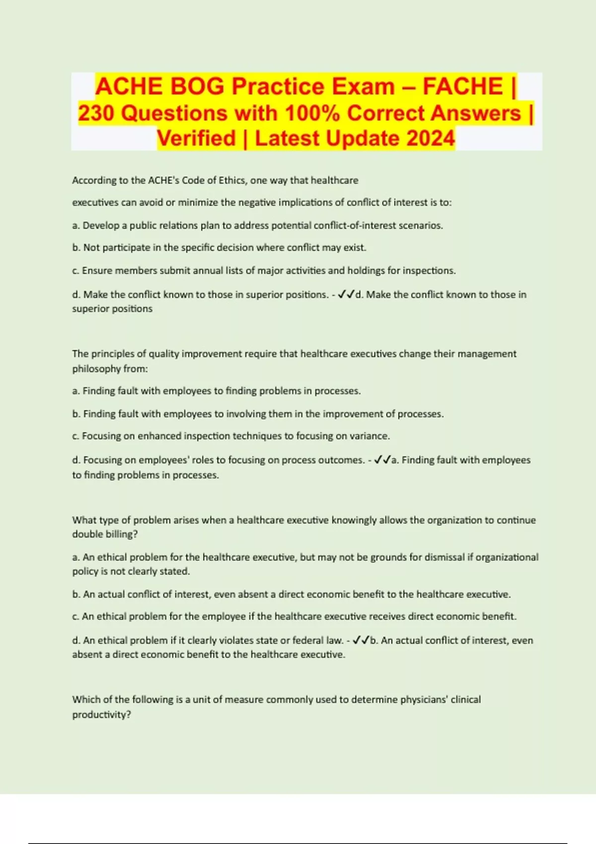 ACHE BOG Practice Exam – FACHE | 230 Questions with 100% Correct Answers | Verified | Latest Update 2024