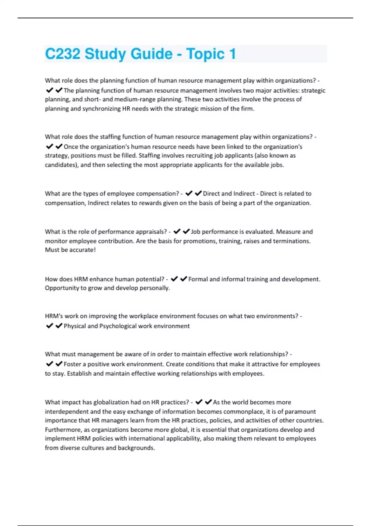 What role does the planning function of human resource management play within organizations? - The planning function of human resource management involves two major activities: strategic planning, and short- and medium-range planning. These two activities involve the process of planning and synchronizing HR needs with the strategic mission of the firm. What role does the staffing function of human resource management play within organizations? - Once the organization's human resource needs have been linked to the organization's strategy, positions must be filled. Staffing involves recruiting job applicants (also known as candidates), and then selecting the most appropriate applicants for the available jobs. What are the types of employee compensation? - Direct and Indirect - Direct is related to compensation, Indirect relates to rewards given on the basis of being a part of the organization. What is the role of performance appraisals? - Job performance is evaluated. Measure and monitor employee contribution. Are the basis for promotions, training, raises and terminations. Must be accurate! How does HRM enhance human potential? - Formal and informal training and development. Opportunity to grow and develop personally. HRM's work on improving the workplace environment focuses on what two environments? - Physical and Psychological work environment What must management be aware of in order to maintain effective work relationships? - Foster a positive work environment. Create conditions that make it attractive for employees to stay. Establish and maintain effective working relationships with employees. What impact has globalization had on HR practices? - As the world becomes more interdependent and the easy exchange of information becomes commonplace, it is of paramount importance that HR managers learn from the HR practices, policies, and activities of other countries. Furthermore, as organizations become more global, it is essential that organizations develop and implement HRM policies with international applicability, also making them relevant to employees from diverse cultures and backgrounds.What are the four implicit HR objectives? - Improve productivity, improve quality of work life, ensure legal compliance, foster ethical behavior How can HR managers make a significant contribution toward productivity improvements? - Work organization and design, allow employees to exercise creativity in performing job tasks How do organizations improve the quality of work life? How have employees' attitudes regarding involvement with their work shifted? - Most employees today desire more autonomy and a change to make a greater contribution to the organization - provide opportunities for employees to realize these aspirations and they will be more content Why is it important that HR mangers and personnel be familiar with the laws and regulations? - Because these laws impact nearly all functions and activities with which HRM is involved. (hiring and pay decisions, promotions, health and safety, labor relations) Define the term "moral philosophy." - the principles, rules, and values that individuals use in deciding what is right or wrong How can HR professionals create a culture where ethical behavior is encouraged? - create a positive work environment, hiring ethical individuals, provide ethical training, labeling and modeling ethical behavior, creating a well-define code of ethics, establishing an open-door policy, providing an employee assistance program Define the term "business ethics." - the values and principals that are used to evaluate whether the collective behavior of members of an organization is appropriate What are the six major trends have been identified as influencing the work environment? - increased competition; the costs and benefits associated with HR utilization; productivity changes; the increasing pace and complexity of social, cultural, legal, demographic and educational changes; the symptoms of dysfunction in the workplace; societal trends of the 21st century Internal Environment: Define "culture" and identify who shapes an organization's culture. - represents an organizations value system. Includes factors such as employees willingness to work, their ethics, how the organization thinks they should be treated, and so on Internal Environment: Define technology. - the equipment and knowledge used to produce goods and services - varies by industryInternal Environment: How does technology influence an organization's structure? - organizational structures have become flatter and flatter - fewer managers or a smaller management hierarchy. Close supervision of employees is unnecessary, allows work to be performed during non-traditional hours and away from physical manufacturing plants and offices