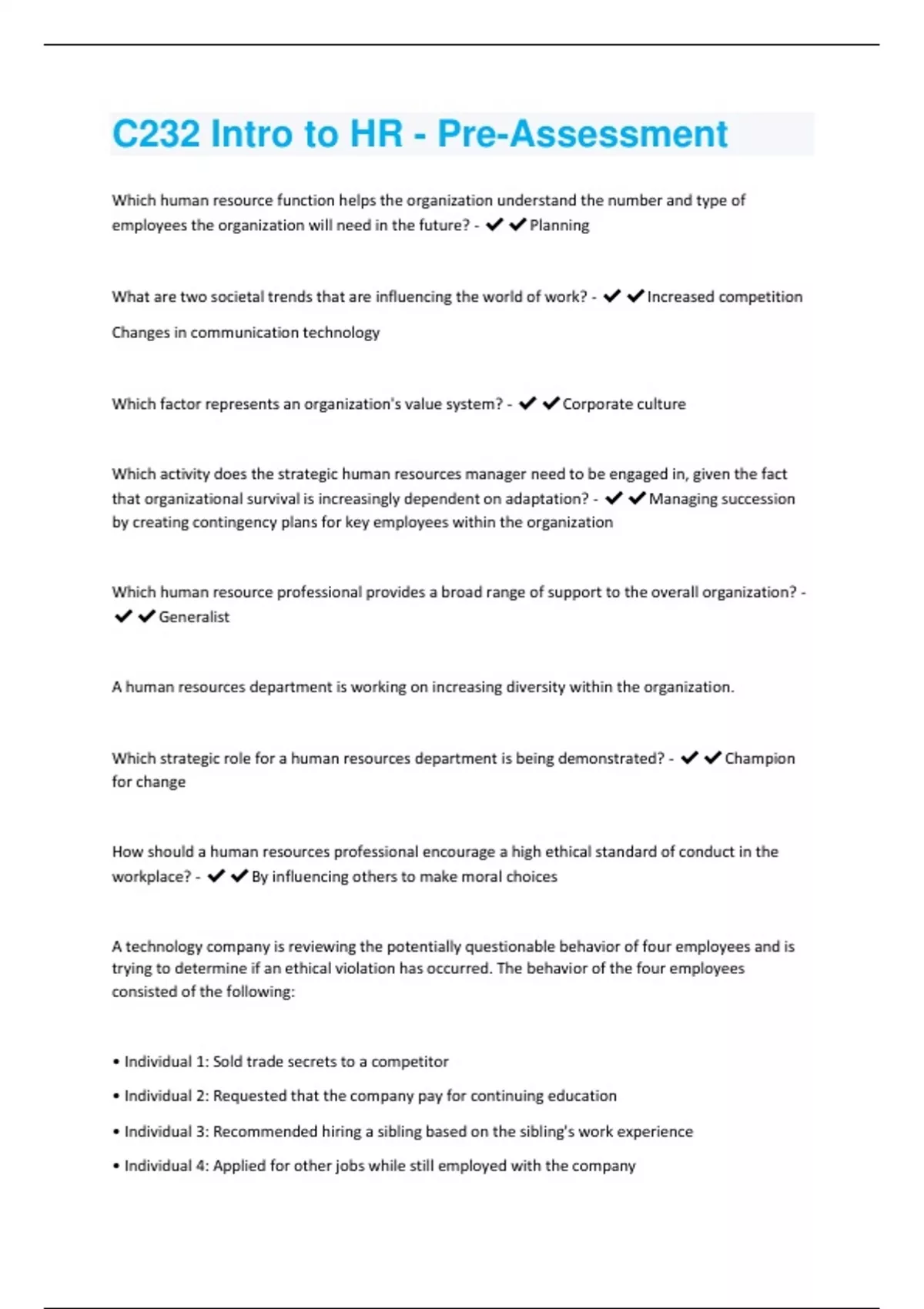 C232 Intro to HR - Pre-Assessment Questions With 100% Correct Solutions.