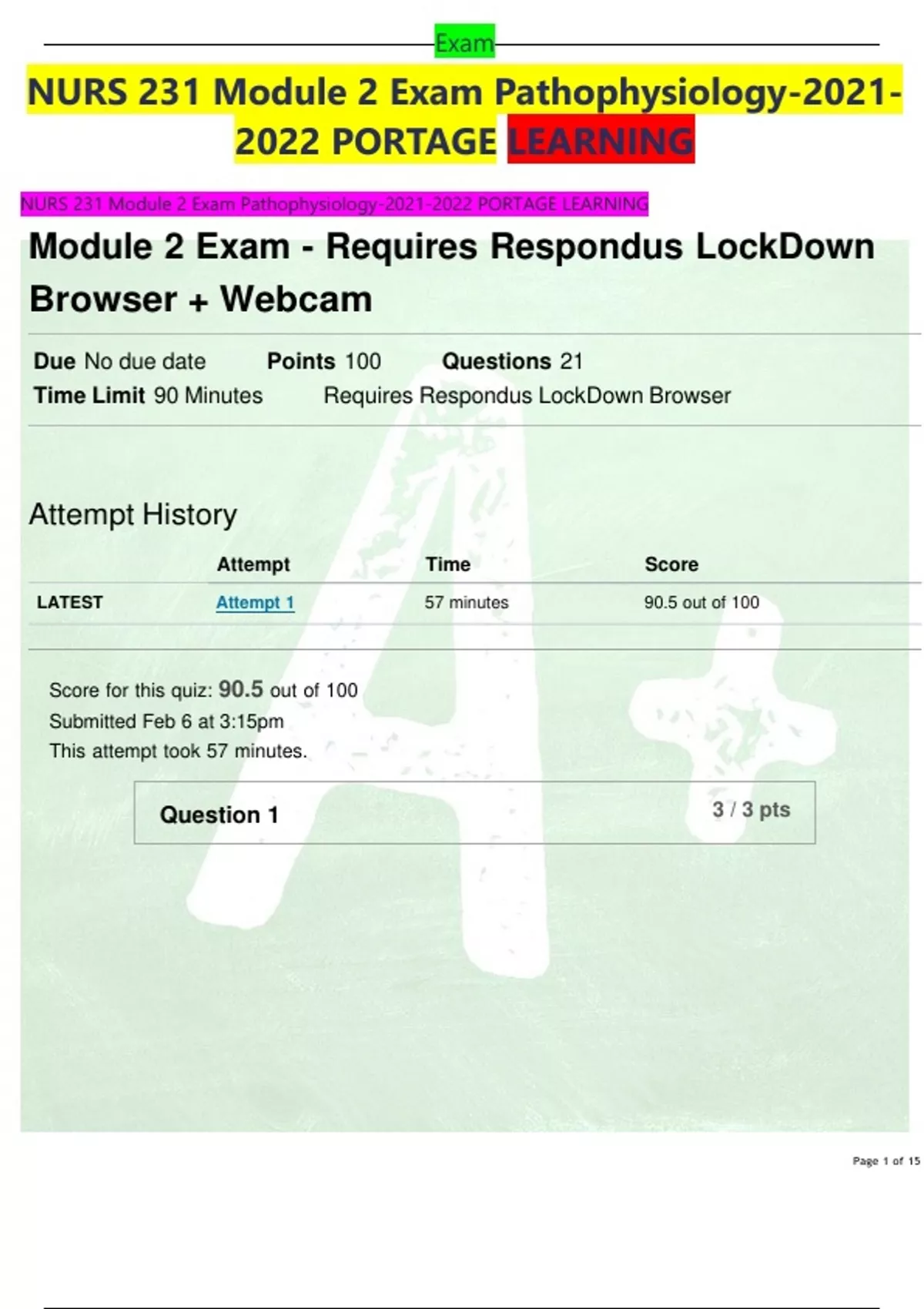 NURS 231 Module 2 Exam Pathophysiology-2021- 2022 PORTAGE LEARNING NURS 231 Module 2 Exam Pathophysiology- PORTAGE LEARNING Module 2 Exam - Requires Respondus LockDown Browser + Webcam Due No due date Points 100 Questions 21 Time Limit 90 Minutes Requires Respondus LockDown Browser Attempt History Attempt Time Score LATEST Attempt 1 57 minutes 90.5 out of 100 Score for this quiz: 90.5 out of 100 Submitted Feb 6 at 3:15pm This attempt took 57 minutes. Question 1 3 / 3 pts Page 2 of 15 Exam NURS 231 Module 2 Exam Pathophysiology-2021- 2022 PORTAGE LEARNING NURS 231 Module 2 Exam Pathophysiology- PORTAGE LEARNING True/False: Blood tests for tumor markers can make a diagnosis of cancer. Why or why not? Your Answer: it is false because,levels are elevated under the bening condition, however the most levels are not elevated in early stages of malignant Page 3 of 15 Exam NURS 231 Module 2 Exam Pathophysiology-2021- 2022 PORTAGE LEARNING NURS 231 Module 2 Exam Pathophysiology- PORTAGE LEARNING False, only tissue can diagnose. Tumor markers are helpful to assess response to therapy or reoccurrence. Question 2 3 / 3 pts What is the most important procedure in diagnosing the correct cancer and histology? Your Answer: tissue biopsy tissue biopsy Question 3 2 / 4 pts