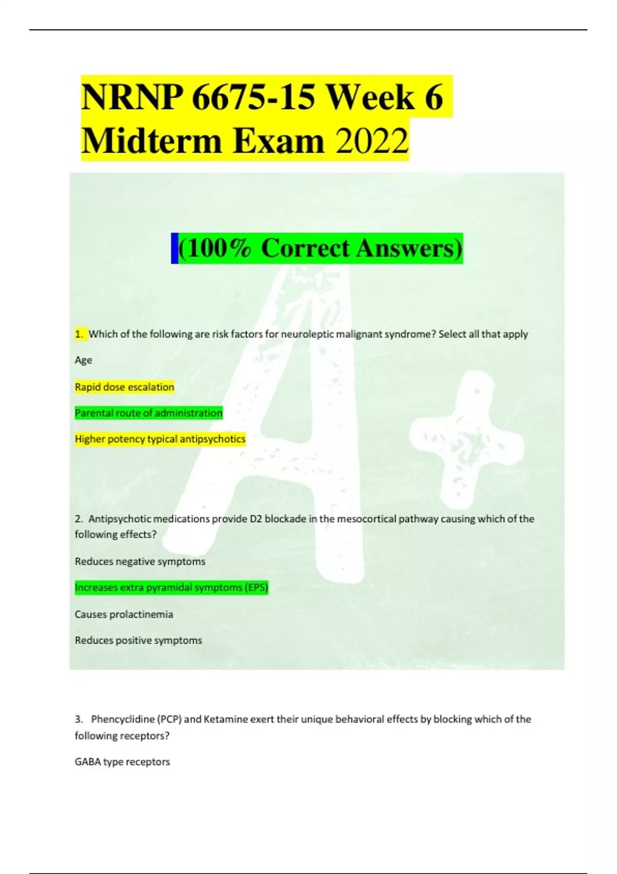 NRNP 6675-15 Week 6 Midterm Exam 2022 (100% Correct Answers) 1. Which of the following are risk factorsfor neuroleptic malignant syndrome? Select all that apply Age Rapid dose escalation Parentalroute of administration Higher potency typical antipsychotics 2. Antipsychotic medications provide D2 blockade in the mesocortical pathway causing which of the following effects? Reduces negative symptoms Increases extra pyramidalsymptoms(EPS) Causes prolactinemia Reduces positive symptoms 3. Phencyclidine (PCP) and Ketamine exert their unique behavioral effects by blocking which of the following receptors? GABA type receptors Serotonin receptors Dopamine receptors NMDA type receptors 4. The diagnosis used to describe a syndrome characterized by specific signs and symptoms resulting from recent ingestion or exposure to a substance is known as which of the following? Substance intoxication Substance withdrawal Substance use disorder Any of the above 5. Abnormal involuntary movements in a rhythmic pattern affecting face, mouth, tongue, jaw is known as which of the following? Akathisia Dystonia Tardive dyskinesia Extrapyramidalside effects 6. A deeply held belief despite evidence to the contrary, lasting at least one month, without prominent hallucinations, with functional impairment that relates to the delusional syste..... Schizophrenia Delusional disorder Brief psychotic disorder Schizophreniform disorder