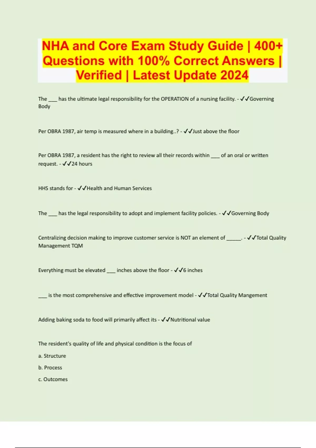 NHA and Core Exam Study Guide | 400+ Questions with 100% Correct Answers | Verified | Latest Update 2024