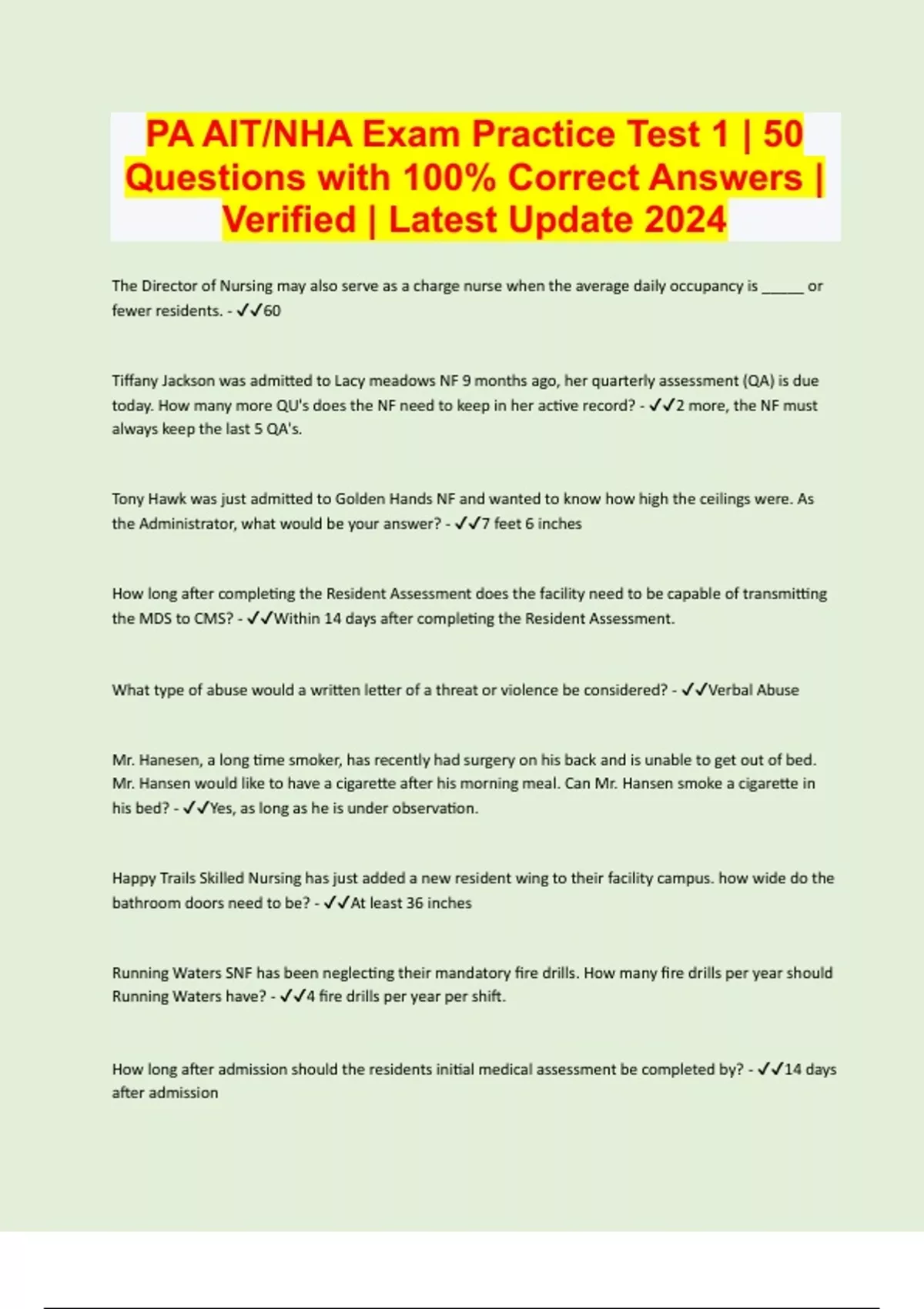 PA AIT/NHA Exam Practice Test 1 | 50 Questions with 100% Correct Answers | Verified | Latest Update 2024