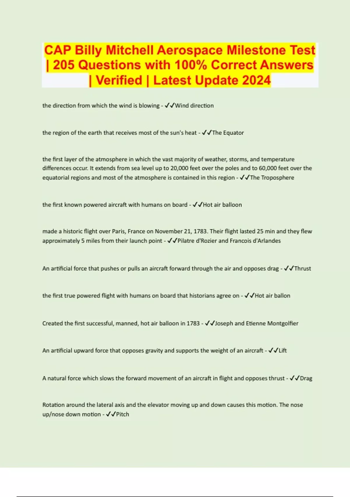 CAP Billy Mitchell Aerospace Milestone Test | 205 Questions with 100% Correct Answers | Verified | Latest Update 2024