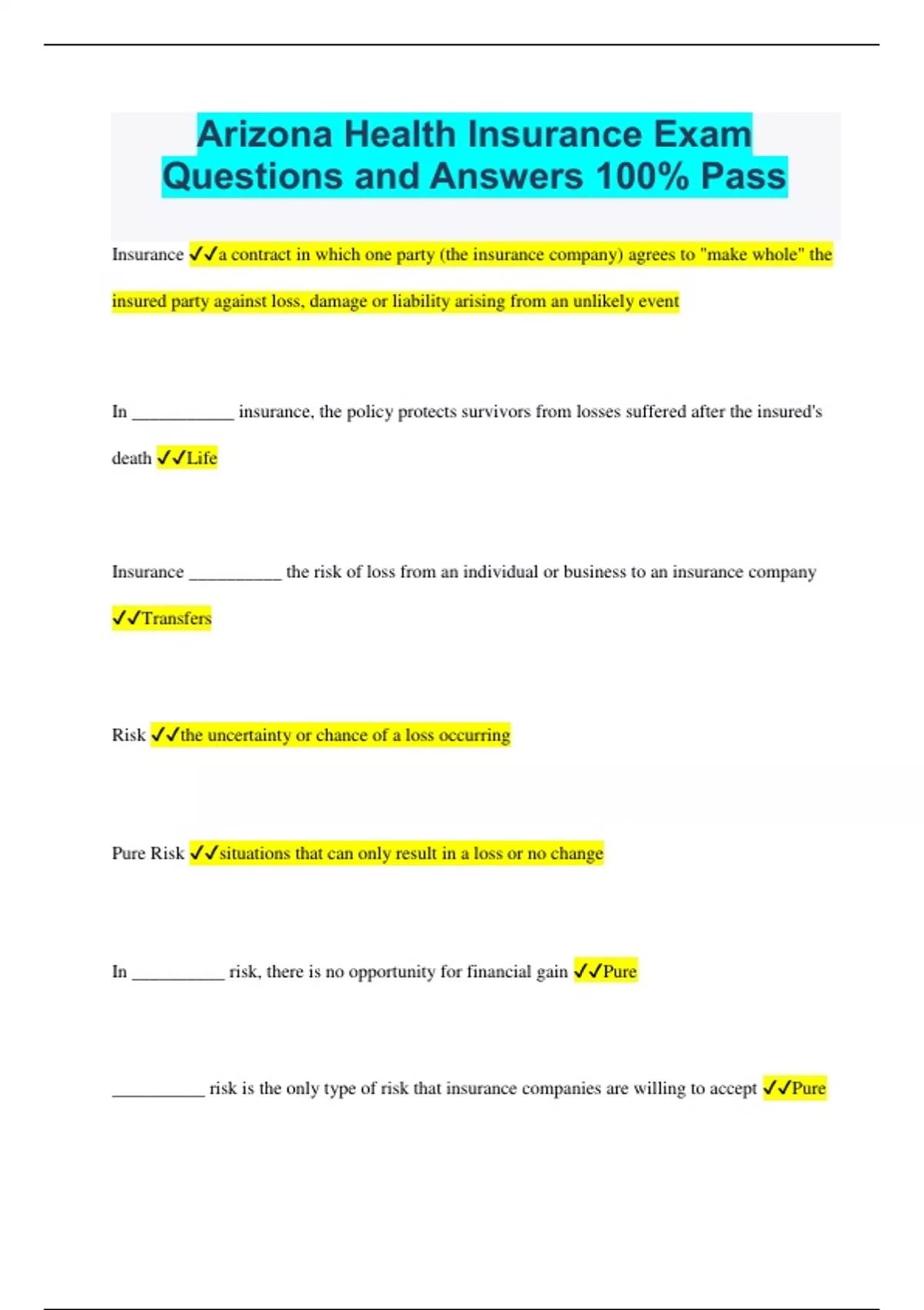 Arizona Health Insurance Exam Questions and Answers 100% Pass