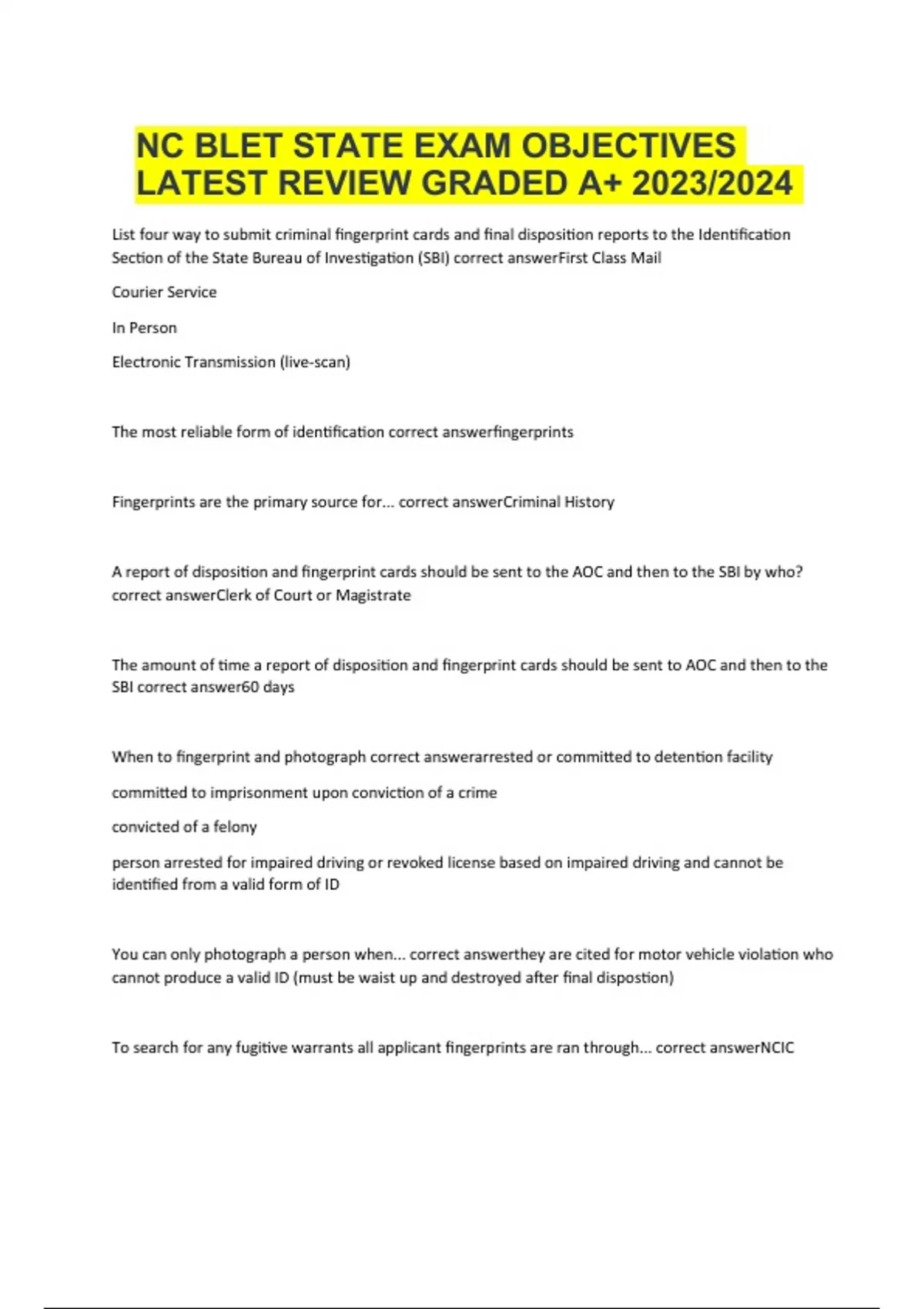 NC BLET STATE EXAM OBJECTIVES, Questions With Answers LATEST UPDATED 2024 (GRADED A+) List four way to submit criminal fingerprint cards and final disposition reports to the Identification Section of the State Bureau of Investigation (SBI) correct answerFirst Class Mail Courier Service In Person Electronic Transmission (live-scan) The most reliable form of identification correct answerfingerprints Fingerprints are the primary source for... correct answerCriminal History A report of disposition and fingerprint cards should be sent to the AOC and then to the SBI by who? correct answerClerk of Court or Magistrate The amount of time a report of disposition and fingerprint cards should be sent to AOC and then to the SBI correct answer60 days When to fingerprint and photograph correct answerarrested or committed to detention facility committed to imprisonment upon conviction of a crime convicted of a felony person arrested for impaired driving or revoked license based on impaired driving and cannot be identified from a valid form of ID You can only photograph a person when... correct answerthey are cited for motor vehicle violation who cannot produce a valid ID (must be waist up and destroyed after final dispostion) To search for any fugitive warrants all applicant fingerprints are ran through... correct answerNCIC When can you fingerprint a juvenile? correct answer10+ years old committed a non-divertible offense complaint has been prepared for filing as a petition juvenile is in custody of LEO or DJJ OR 10+ years old juvenile is adjudicated delinquent for a felony what are the two types of fingerprints taken correct answerrolled prints (from nail to nail) plain for fixed impression (all 4 fingers printed at one time) 3 types of fingerprint patters correct answerarch loop whorl 3 purposes of the officer's field notes correct answerreport writing evidence reference 6 one-word questions that should be answered when developing field notes correct answerwho what when where why how Field notes are correct answera shorthand writting record made by the LEO from the time they arrived on a scene until an assignment is completed Field notes are used to... correct answerreveal inconsistencies basis for final report used as evidence chronology of investigation identify individuals and locations reveal and identify leads ensure admissibility of evidence What should be included in your field notes correct answerdates and times officers on scene location weather conditions sketches direct quotes from questioning info for individuals descriptions 4 uses of law enforcement reports correct answerrecord of officer's knowlede communications with others contains statistical information provides information to be used in other criminal investigations 2 types of narratives correct answerpublic confidential records not availible to the public correct answerjuvenile records traffic accident reports body worn camera footage dashboard footage What is an interview conducted outside of the law enforcment ageny? (used for identificaiton, prevention and repression of crime and cetralized records of field contact) correct answerfield interview The questioning of a suspect IN-CUSTODY to gain cooperation and reveal the truth. correct answerinterrogation An interview of person(s) in the area surrounding a crime scene to identify potential witnesses correct answercanvass interview 6 essential questios that should be asked in every interview you conduct correct answerwho what when where why how 2 types of interview questions asked correct answeropen-ended questions closed ended questions open-ended questions are used to... correct answerpromote conversation gain descriptive information gain a narration of events prevent leading the interviewee and revealing case informatino close-ended questions are used to... correct answerclarify particular points restrick the interviewee's opportunity to tal requires a specific response when interviewing a suspect focus on... correct answereliminating or identifying the intrviewee as a suspect When conducting a cognitive interview you should... correct answerget the interviewee to tell you a timeline of events, then ask them to repeat the timeline in reverse to see if their timeline is truthful. human trafficking is commonly referred to as... correct answermodern day slavery What is the difference between human trafficking and human smuggling? correct answerhuman trafficking- not volutary forced exploition for labor or service does not need movement domestic or international smuggling- voluntary ends after border is crossed fee is usually paid in advance or on arrival international what are some traumatic effects upon victims of human trafficking correct answermay repeat cover stories unfamiliar with our legal system fear punishment for any illeal activity they may have been forced to engage in forms of exploitation associated with human trfficking correct answersexual labor seevile marriage Violations that lead to the uncovering of human trafficking correct answerdomestic violence crime labor disputes prostitution and pimping offenses shoplifting cases of assault 2 types of responses to human trafficking correct answerreactive approach proactive approach When an officer uncovers elements of trafficking while answering other calls. correct answerreactive approach when an officer takes the initiative to identify places in the community where they suspect trafficking is occuring and begin to build a case against the traffickers in a covert manner. correct answerproactive approach N.C. G.S. 14-43.11 correct answerHuman Trafficking human trafficking victim resources correct answernational human trafficking hotline leagal aid of NC social services T or U visa (must cooperate with law enforcement) local resources for human trafficking correct answerNCCAHT dept. of social services dept. of public health dept. of mental health domestic violence ans sexual assault services Law Enforcement recources for