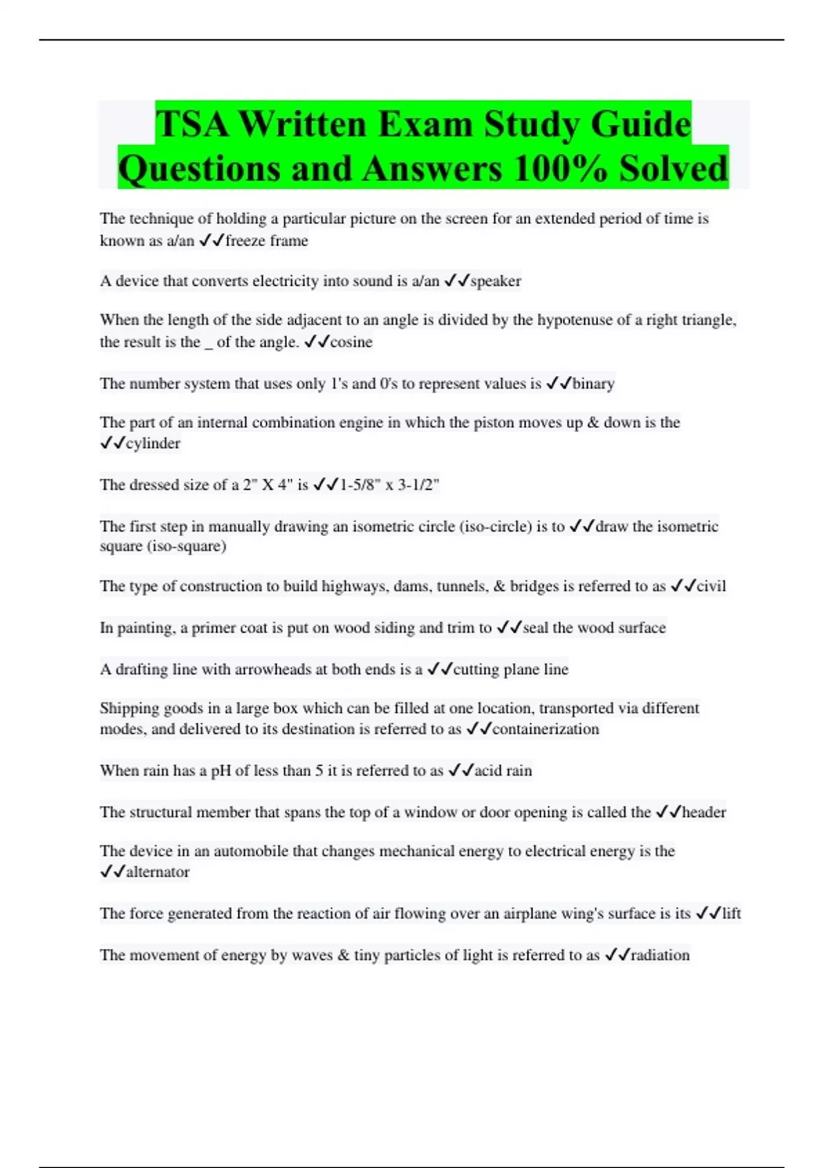 TSA Written Exam Study Guide Questions and Answers 100% Solved The technique of holding a particular picture on the screen for an extended period of time is known as a/an freeze frame A device that converts electricity into sound is a/an speaker When the length of the side adjacent to an angle is divided by the hypotenuse of a right triangle, the result is the _ of the angle. cosine The number system that uses only 1's and 0's to represent values is binary The part of an internal combination engine in which the piston moves up & down is the cylinder The dressed size of a 2" X 4" is 1-5/8" x 3-1/2" The first step in manually drawing an isometric circle (iso-circle) is to draw the isometric square (iso-square) The type of construction to build highways, dams, tunnels, & bridges is referred to as civil In painting, a primer coat is put on wood siding and trim to seal the wood surface A drafting line with arrowheads at both ends is a cutting plane line Shipping goods in a large box which can be filled at one location, transported via different modes, and delivered to its destination is referred to as containerization When rain has a pH of less than 5 it is referred to as acid rain The structural member that spans the top of a window or door opening is called the header The device in an automobile that changes mechanical energy to electrical energy is the alternator The force generated from the reaction of air flowing over an airplane wing's surface is its lift The movement of energy by waves & tiny particles of light is referred to as radiation