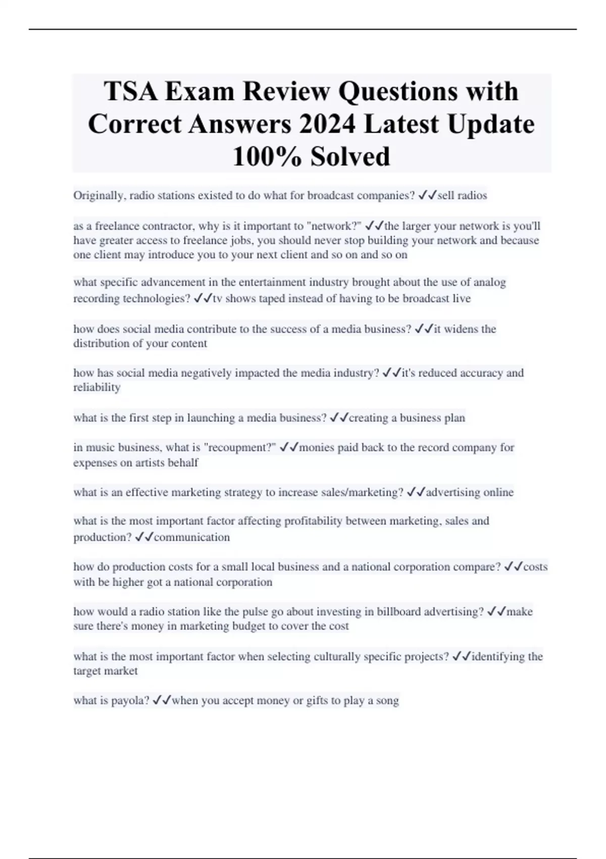 TSA Exam Review Questions with Correct Answers 2024 Latest Update 100% Solved Originally, radio stations existed to do what for broadcast companies? sell radios as a freelance contractor, why is it important to "network?" the larger your network is you'll have greater access to freelance jobs, you should never stop building your network and because one client may introduce you to your next client and so on and so on what specific advancement in the entertainment industry brought about the use of analog recording technologies? tv shows taped instead of having to be broadcast live how does social media contribute to the success of a media business? it widens the distribution of your content how has social media negatively impacted the media industry? it's reduced accuracy and reliability what is the first step in launching a media business? creating a business plan in music business, what is "recoupment?" monies paid back to the record company for expenses on artists behalf what is an effective marketing strategy to increase sales/marketing? advertising online what is the most important factor affecting profitability between marketing, sales and production? communication how do production costs for a small local business and a national corporation compare? costs with be higher got a national corporation how would a radio station like the pulse go about investing in billboard advertising? make sure there's money in marketing budget to cover the cost what is the most important factor when selecting culturally specific projects? identifying the target market what is payola? when you accept money or gifts to play a song