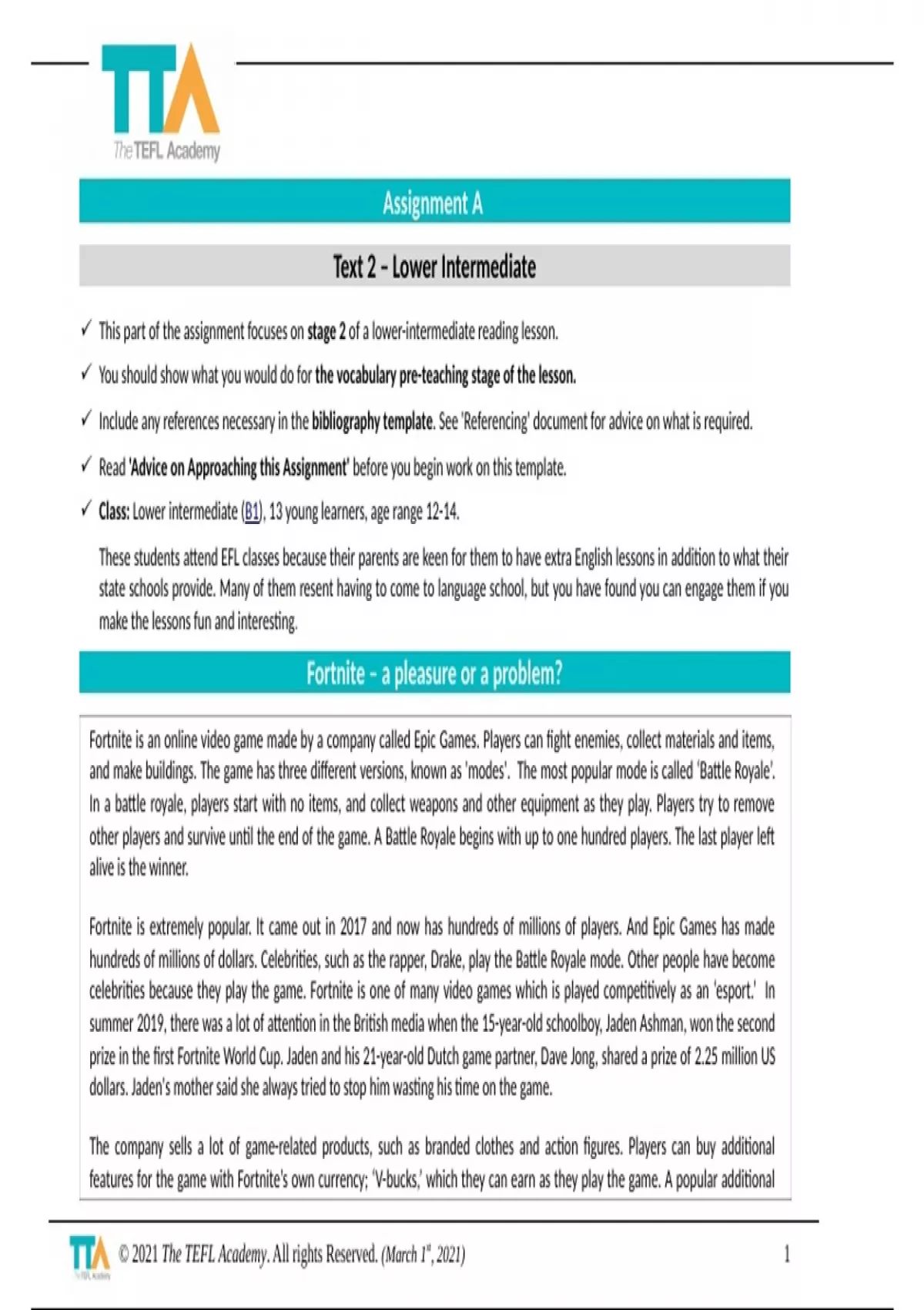 Assignment A Text 2 – Lower Intermediate This part of the assignment focuses on stage 2 of a lower-intermediate reading lesson. You should show what you would do for the vocabulary pre-teaching stage of the lesson. Include any references necessary in the bibliography template. See 'Referencing' document for advice on what is required. Read 'Advice on Approaching this Assignment' before you begin work on this template. Class: Lower intermediate (B1), 13 young learners, age range 12-14. These students attend EFL classes because their parents are keen for them to have extra English lessons in addition to what their state schools provide. Many of them resent having to come to language school, but you have found you can engage them if you make the lessons fun and interesting. Fortnite – a pleasure or a problem? Fortnite is an online video game made by a company called Epic Games. Players can fight enemies, collect materials and items, and make buildings. The game has three different versions, known as 'modes'. The most popular mode is called ‘Battle Royale’. In a battle royale, players start with no items, and collect weapons and other equipment as they play. Players try to remove other players and survive until the end of the game. A Battle Royale begins with up to one hundred players. The last player lef alive is the winner. Fortnite is extremely popular. It came out in 2017 and now has hundreds of millions of players. And Epic Games has made hundreds of millions of dollars. Celebrities, such as the rapper, Drake, play the Battle Royale mode. Other people have become celebrities because they play the game. Fortnite is one of many video games which is played competitively as an ‘esport.’ In summer 2019, there was a lot of attention in the British media when the 15-year-old schoolboy, Jaden Ashman, won the second prize in the first Fortnite World Cup. Jaden and his 21-year-old Dutch game partner, Dave Jong, shared a prize of 2.25 million US dollars. Jaden's mother said she always tried to stop him wasting his time on the game. The company sells a lot of game-related products, such as branded clothes and action figures. Players can buy additional features for the game with Fortnite’s own currency; ‘V-bucks,’ which they can earn as the