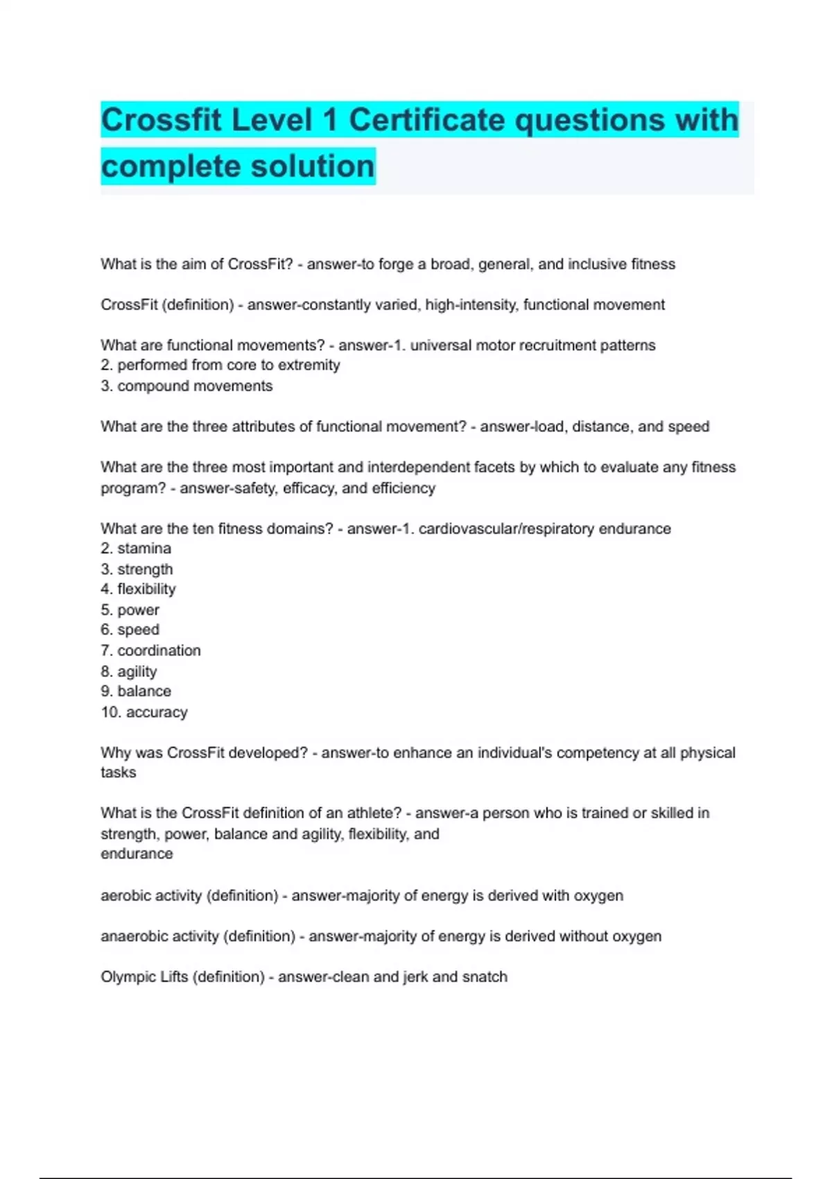 Crossfit Level 1 Certificate questions with complete solution